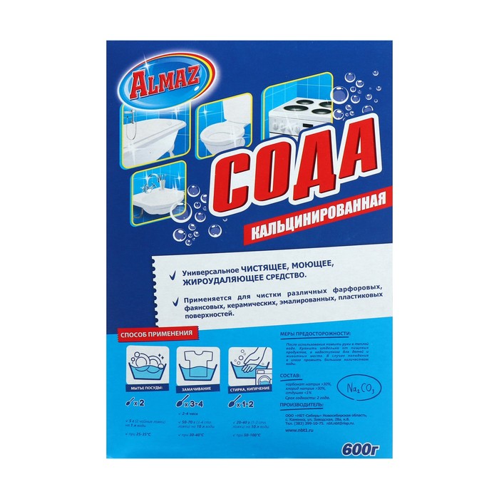 Алмаз Сода кальцинированная универсальное чистящее и моющее средство. Применяется для мытья фарфора, фаянсовой и эмалированной посуды. Эффективно удаляет загрязнения с электрической плиты, духовки, гриля, микроволновой печи, вытяжки и т.д. Незаменим для мытья раковин, душевых кабин, кафеля, ванн и унитазов, удаляя въевшуюся грязь и другие трудновыводимые загрязнения. Не содержит фосфатов, является естественной добавкой для стирального порошка, так же может полностью его заменить, смягчает воду, не раздражает кожу.Состав: Карбонат натрия >30%, хлорид натрия > 30%, отдушка <1%.Меры предосторожности: После использования помыть руки в теплой воде. Хранить отдельно от пищевых продуктов, в недоступном для детей и животных месте. В случае попадания в глаза промыть большим количеством воды.Условия хранения: Хранить в сухом прохладном месте, вдали от нагревательных приборов и пищевых продуктов. Беречь от детей.Срок годности: 2 года.