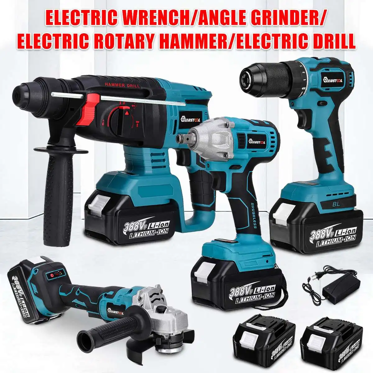 Посылка включает в себя: Тип A 1 х электрический ключ 1 x угловая шлифовальная машина 125 мм 1x13 мм электрическая дрель 1 x Электрический роторный молоток 1 х коробка для хранения Тип B 1 х электрический ключ 1 x угловая шлифовальная машина 125 мм 1x13 мм электрическая дрель 1 x Электрический роторный молоток 1 x литий-ионный аккумулятор Зарядное устройство-1 шт. 1 х коробка для хранения