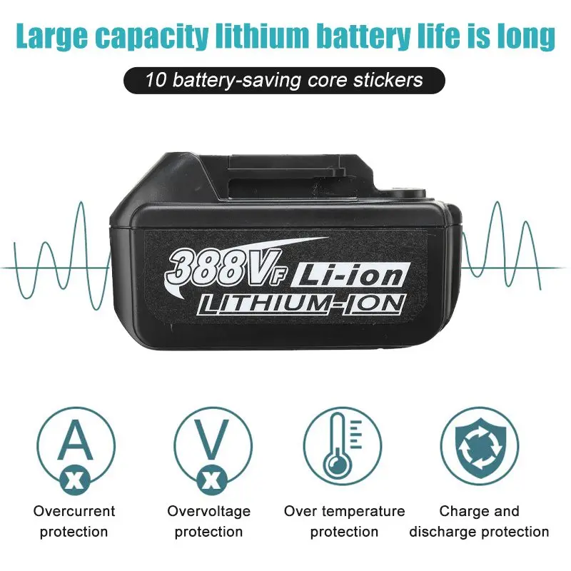 Электрическая дрель Крутящий момент: 25-90NM Шестерня: 21 + 2 Бесщеточный двигатель оборотов: 0-4500 об/мин Челюсть: 13 мм Аккумулятор: 388VF Емкость аккумулятора: 22900 мАч/шт.