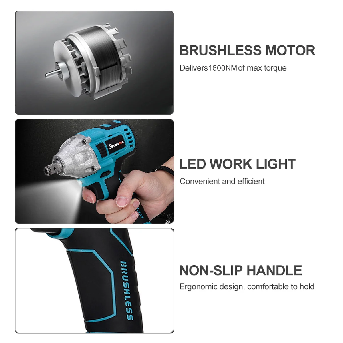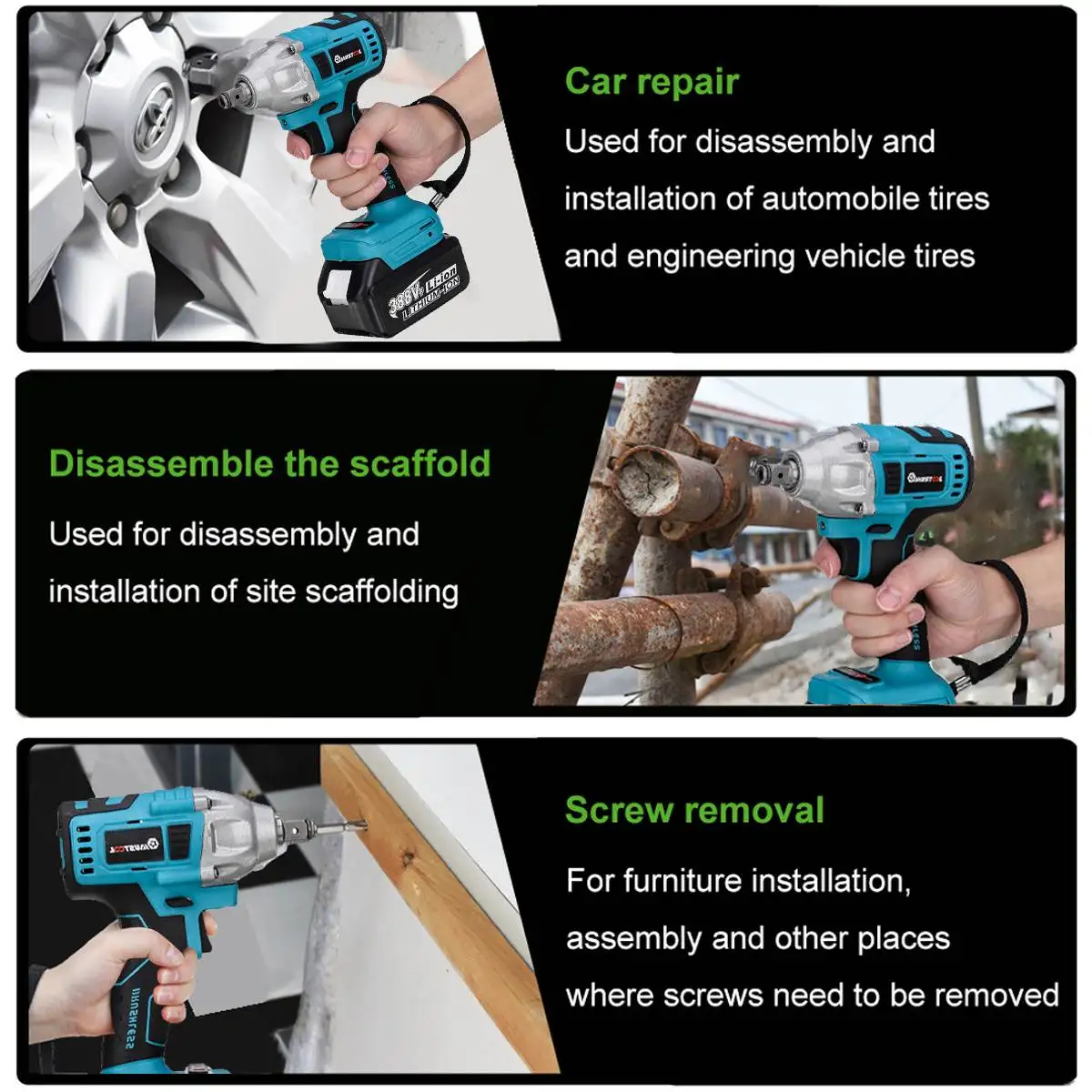 Особенности: Электрический гаечный ключ 800N.M высокий крутящий момент, плавный Переключатель изменения скорости. Мощный электрический гаечный ключ, многоцелевой, супер мощный. Вал из вольфрамовой стали, высокая твердость и износостойкость. Подходит для строительных площадок, технического обслуживания, деревообработки и т. Д. Бесщеточный двигатель не генерирует искры, когда он работает, и двигатель не изнашивается. Светодиодный светильник. Светильник с индикатором зарядки с 2 передачами