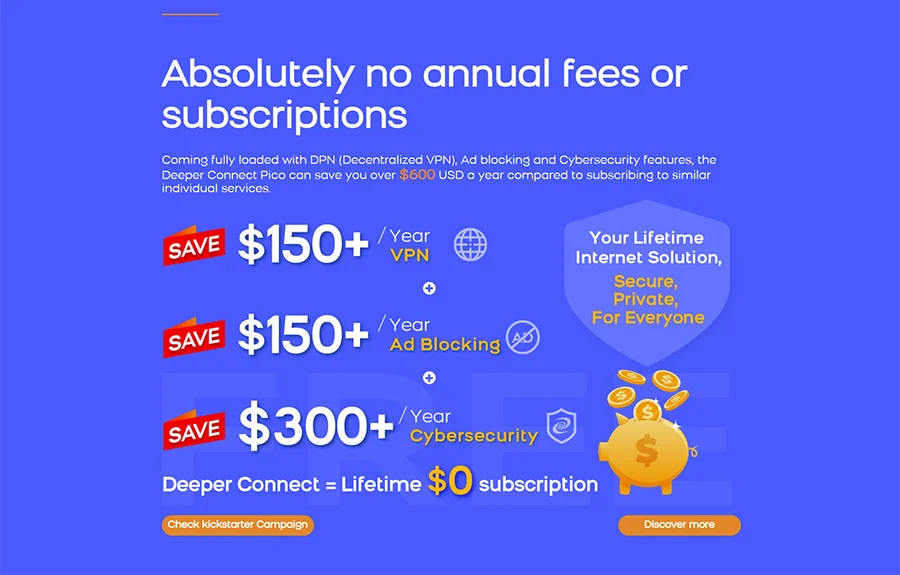 Полностью загружается DPN (децентрализованная vpn-система), блокировка рекламы и функции кибербезопасности, более глубокое подключение Pico может сэкономить более $600 долларов США в год по сравнению с подпиской на аналогичные индивидуальные услуги.