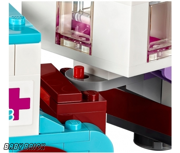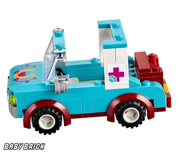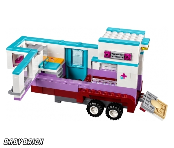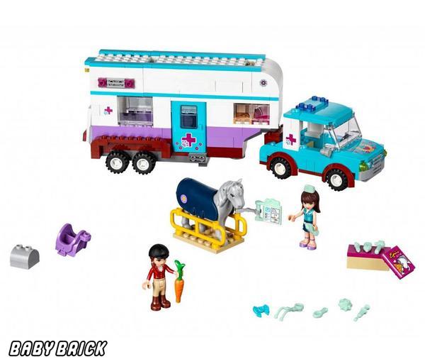 Выпущенный в серии Lego Friends набор «Ветеринарная машина для лошадок» рассчитан на девочек 6-12 лет. Из 370 элементов конструктора можно собрать передвижную медстанцию. Маленький автомобиль везет трейлер, оборудованный всем необходимым для оказания первой помощи животным: инструментами, лекарствами, специальными носилками. Пациент - серый конь Оливии. Хозяйка успокаивает питомца и угощает морковкой, а одетая в голубую форму София осматривает пострадавшего. Фигурки подруг и лошади входят в комплект.
