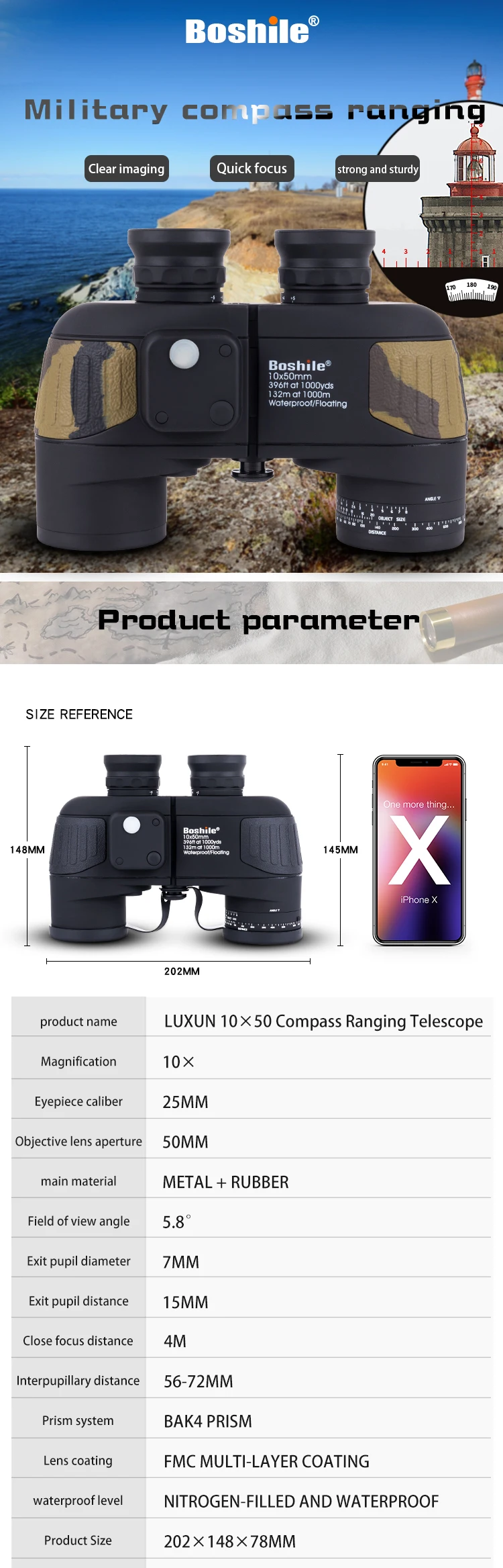 Boshile 10X50 HD высокомощный бинокль с дальномером компас военный азот Водонепроницаемый Телескоп для охоты Наблюдение за птицами