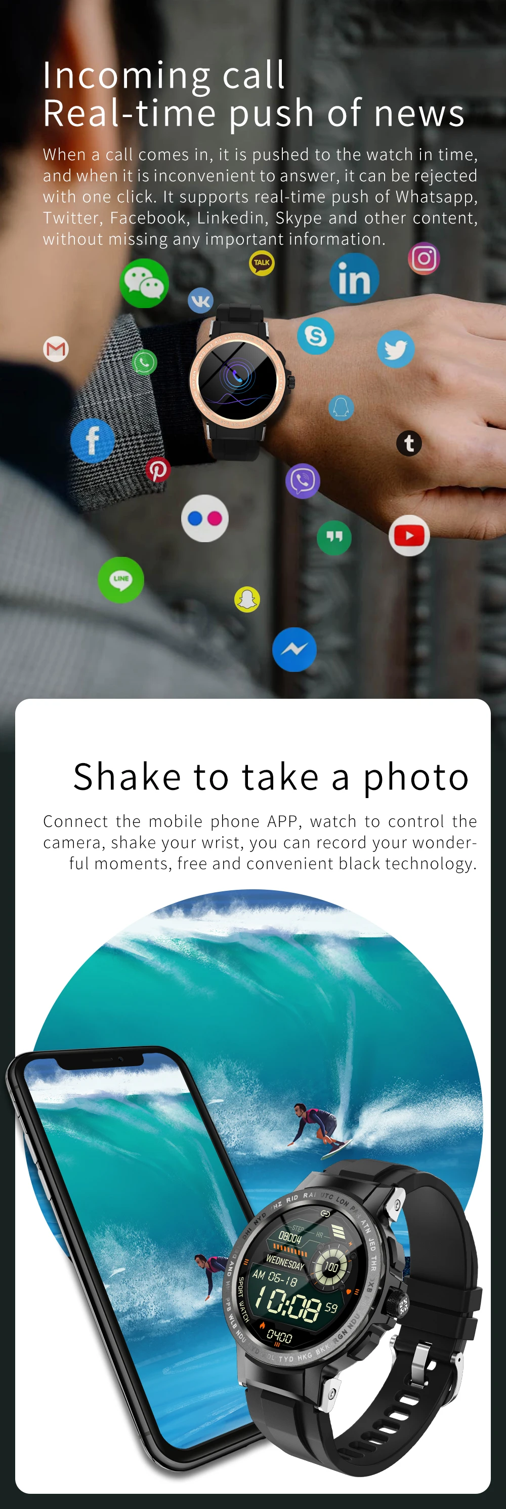 Phone calls reminding, SMS, QQ, WeChat, nailing, wang zhen, sina weibo, lnstagram, linkeln, Snapchat, bursts, Facebook, Skype, Twitter, WhatsApp, Line, KakaoTalk message content delivery