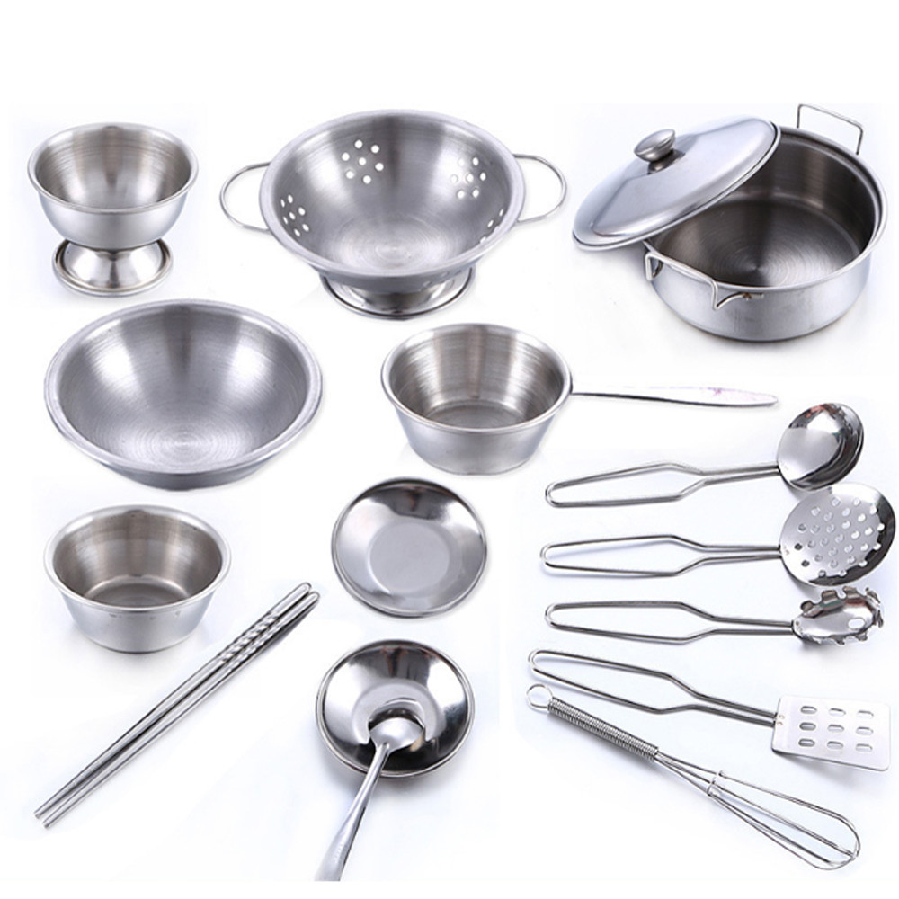 Набор из 16 предметов для детей, игровой домик, кухонные игрушки, кухонная утварь, кастрюли, сковороды, подарок Описание: Безопасный и прочный материал: полированная вручную нержавеющая сталь.