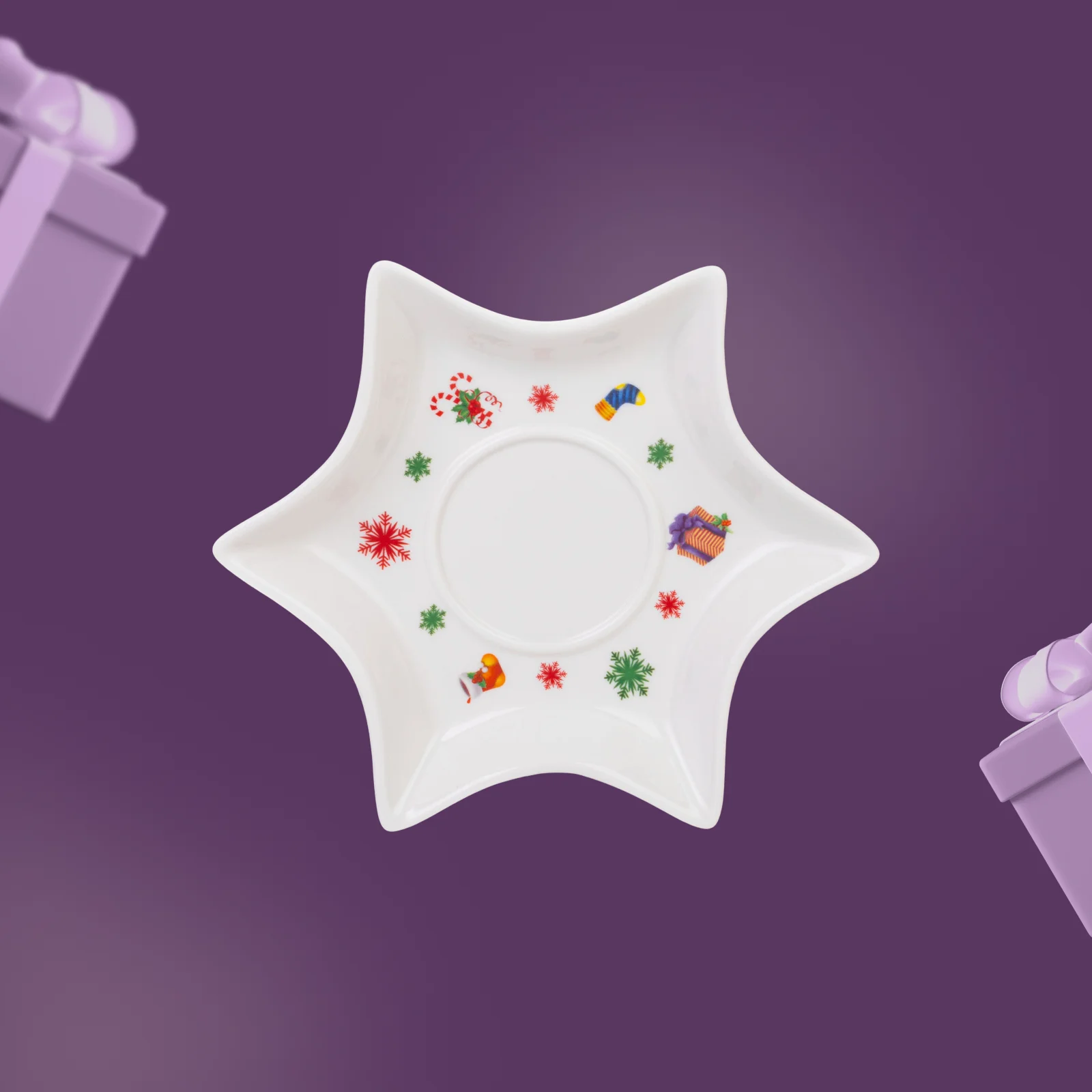 Блюдце, объемом 260 мл, украшено символами новогодней темы: снежинками, подарком, валенком, посохом. Рисунок в минималистичном исполнении аккуратно нанесен по окружности тарелки.