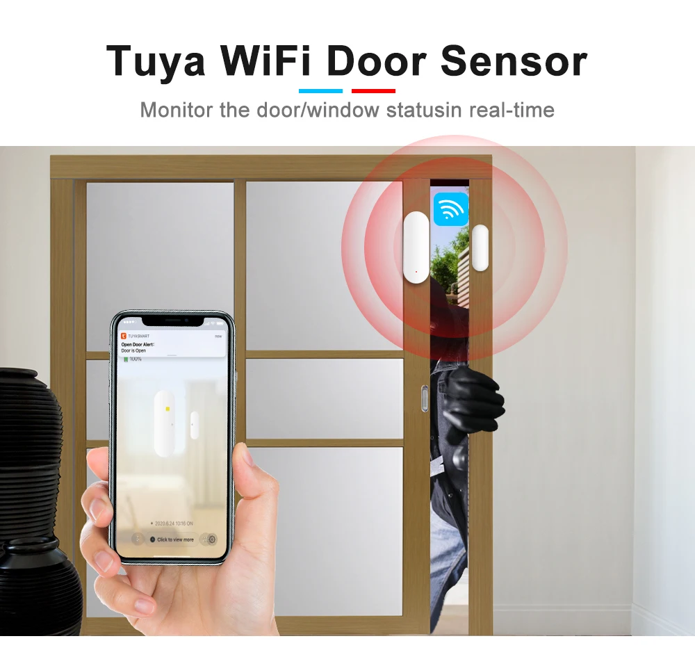 Когда ваша дверь и окно открываются/вторгаются нарушителем, датчик отправит сигнал Wi-Fi, который будет получен маршрутизатором, тогда мобильное приложение будет нажимать уведомление о тревоге.