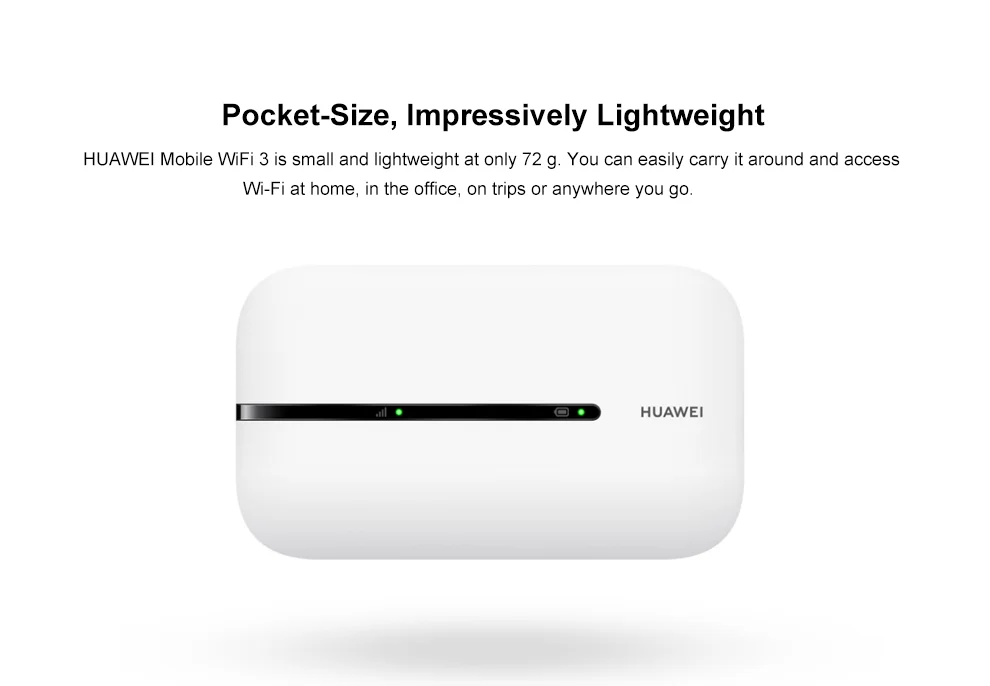 HUAWEI Mobile WiFi 3 небольшой и легкий, всего 72g. Вы можете легко носить его с собой и получить доступ к Wi-Fi дома, в офисе, в поездках или в любом месте.