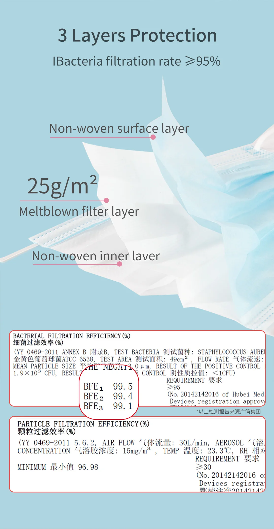 ● 3 слоя защиты, устойчивость против бактерий эффективность фильтрации ≥ 95%