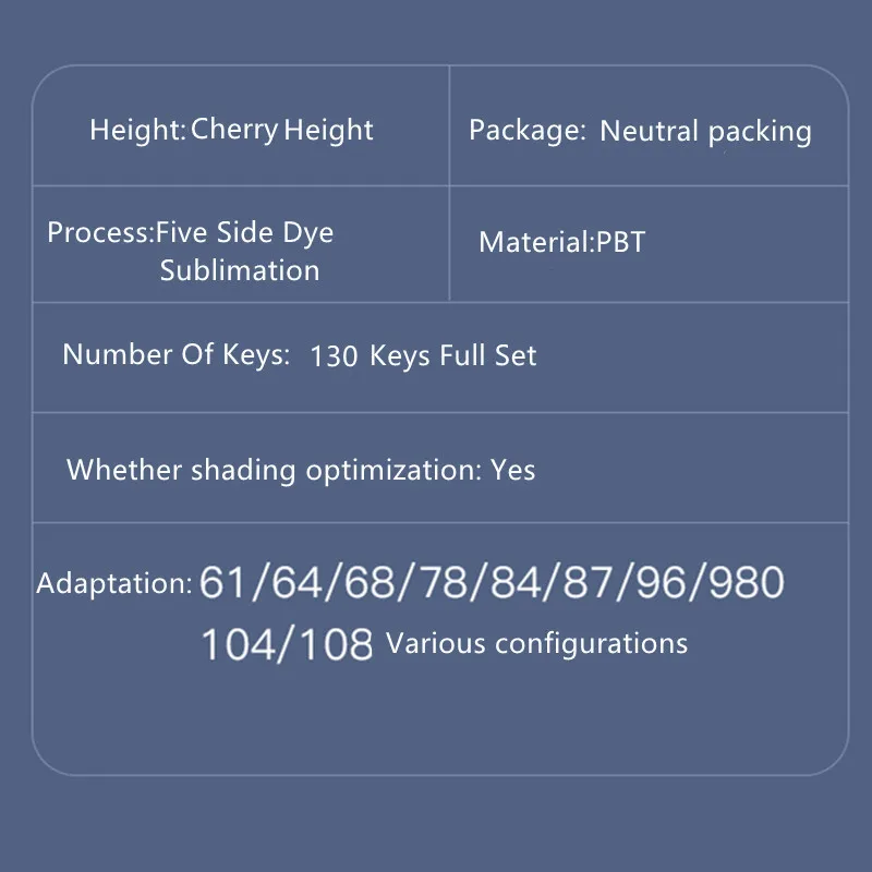 | Основная особенность | Колпачки для ключей с изображением вишни Разработанный с популярным профилем вишни, этот набор ключей может работать как самый простой и удобный набор. Если вы ищете что-то, что может улучшить ваш игровой опыт, не тратьте миллисекунды на поиск следующего ключа, просто получите этот профиль вишни PBT keycaps set, так как он скульптурный, чтобы быть эффективным и удобно давит. PBT прочный материал Вместо того, чтобы выбрать обычный материал ABS для просвечивающих колпачков, мы выбрали ПБТ, который является более дорогим, но более жестким и хрупким. Текстурированное плотное ощущение уникально и не выцветает после использования в течение длительного времени. Технология сублимации краски Сублимация красителя, цвет яркий, уровень четкий, может включать в себя детали, чтобы показать разницу прилегающих тонких цветов; Его специальная лента Содержит уникальную защитную пленку, которые могут достичь производительности непрерывной цветовой градации, по сравнению с половинной цветовой градацией струйной печати другими словами, Технология сублимации краски-это технология печати, которая действительно достигает качества фотографий; С точки зрения сохранения фотографий, благодаря ее защитному слою, сублимация красителя имеет большее преимущество, чем другие технологии печати с точки зрения водонепроницаемости, УФ-защиты и отпечатков пальцев.Совместимость:ЭтоСовместимость с 61, 64, 68, 84, 87, 96, 980, 104, 108 и т. д. раскладная механическая клавиатура с переключателями MX |