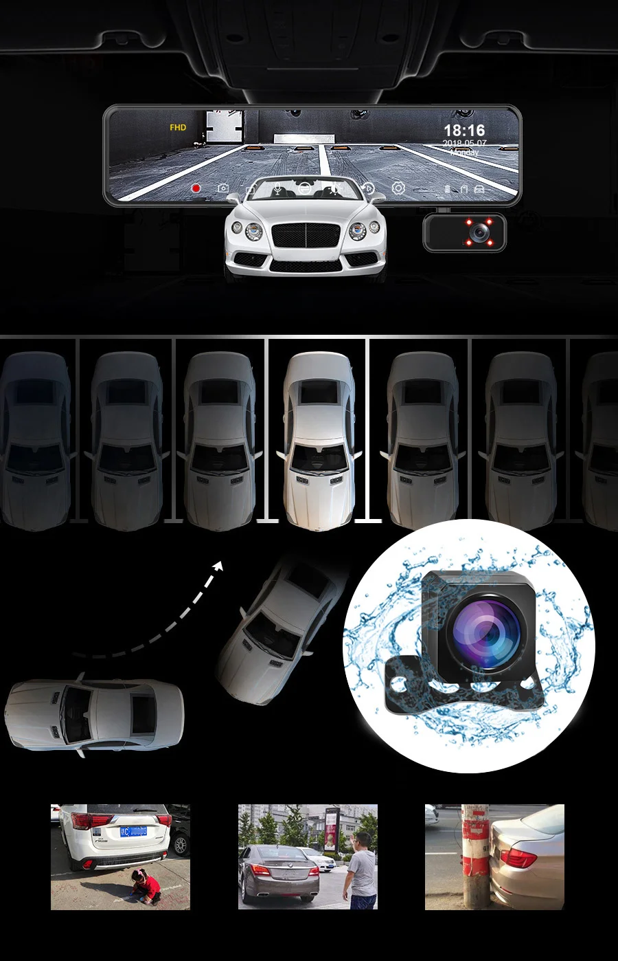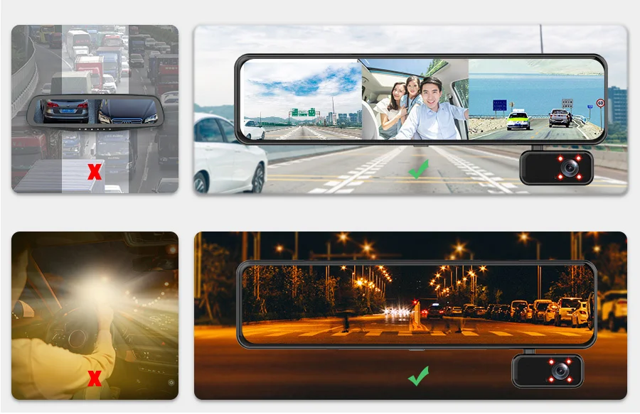 3 Сплит-экрана для переключения переднего и заднего вида, встроенная запись, большой экран и четко и ersily для проверки заднего вида. Вы можете переключать виды, проводя пальцем влево или вправо.