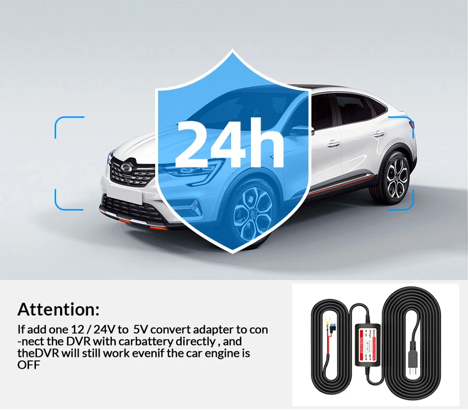 Если вы беспокоитесь о том, что ваш автомобиль был поврежден кем-то другим после парковки, вы можете использовать нашу линию buck для подключения видеорегистратора, чтобы гарантировать, что рекордер работает 24 часа. Если кто-то другой повредит ваш автомобиль, и шок вызывает g-сенсор, видеорегистратор немедленно включится и запишет ситуацию.
