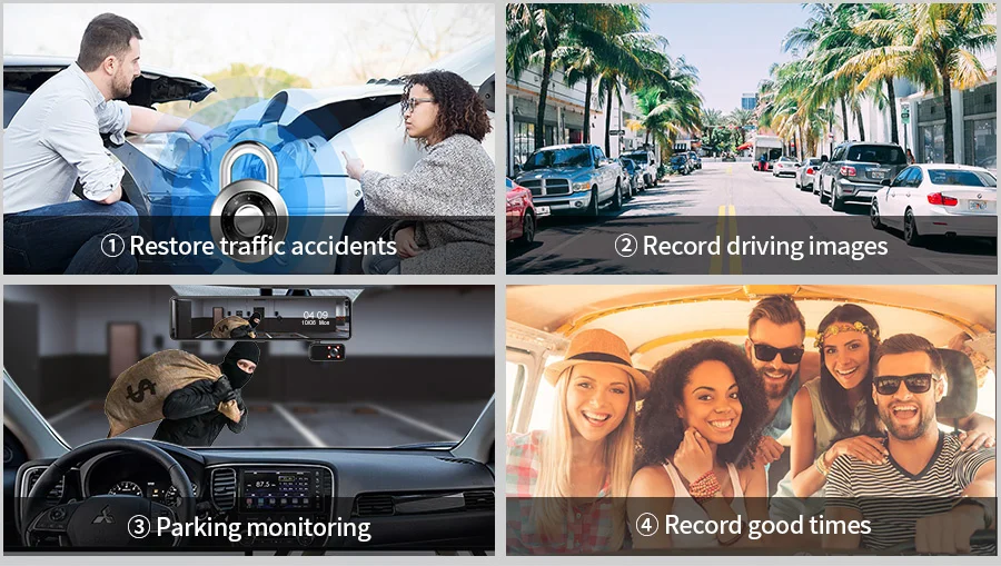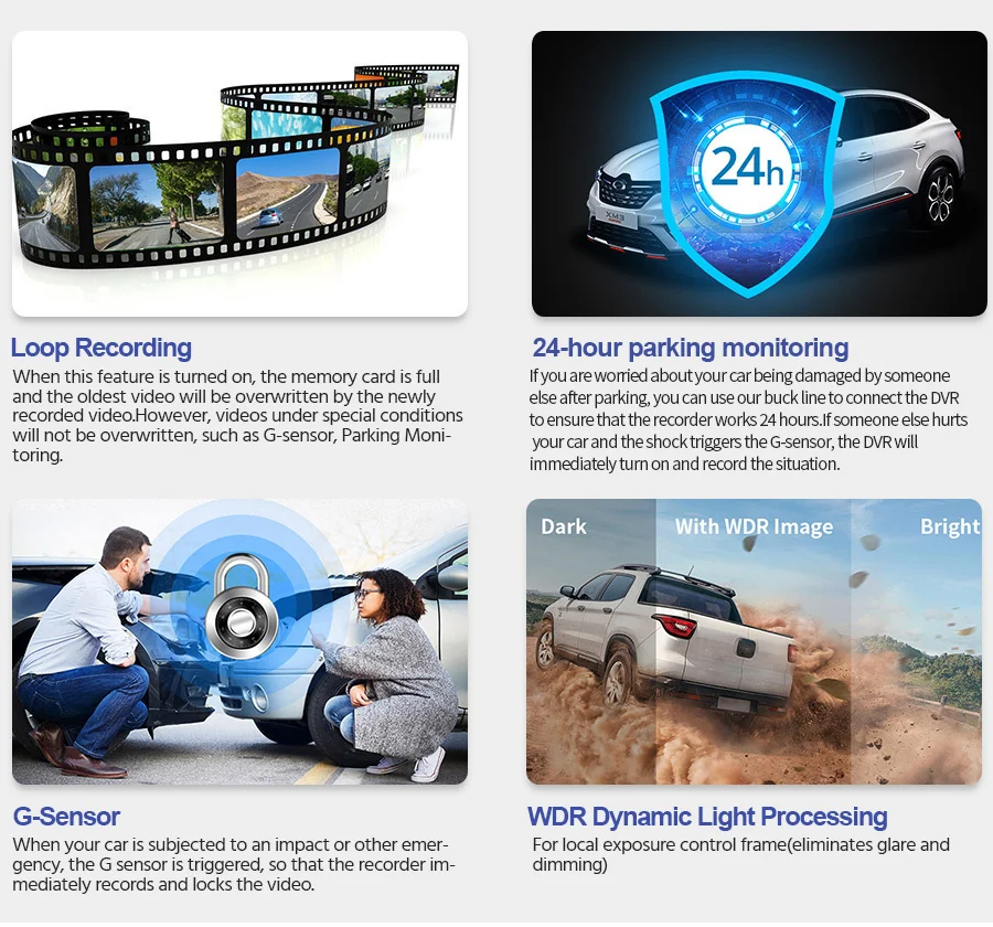 ▶Разрешение видео: фронтальная: 1920*1080P @ 30 кадров в секунду; Задняя: 1920*1080P @ 30 кадров в секунду; Внутренняя: 1920*1080P @ 30 кадров в секунду