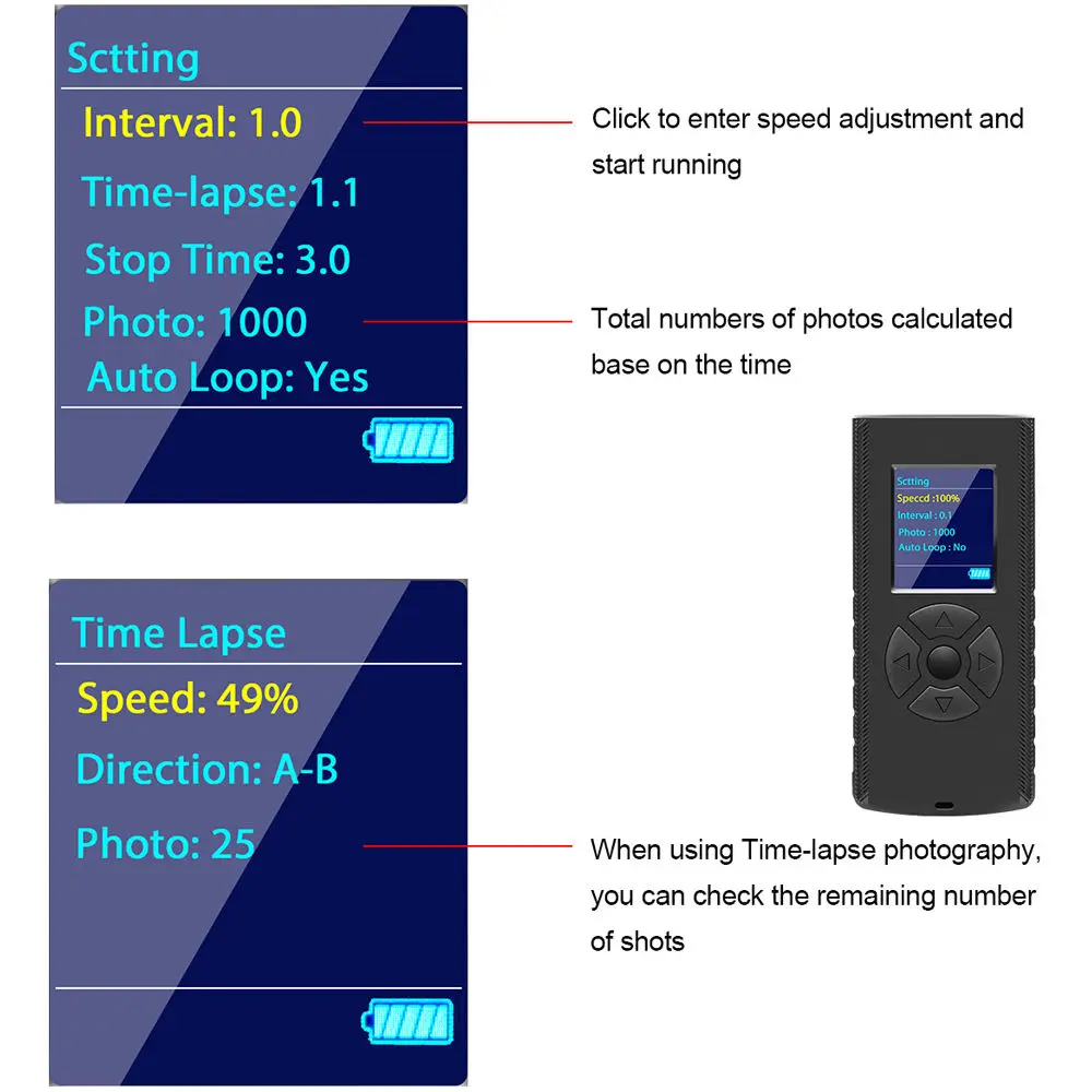 GT-J120D слайдер с моторизованным видео поддерживает съемку во времени и движется с заданными интервалами, установленными пользователем. Вы можете установить скорость скольжения, интервал скольжения, время остановки, номер фотографии и автоматический цикл.