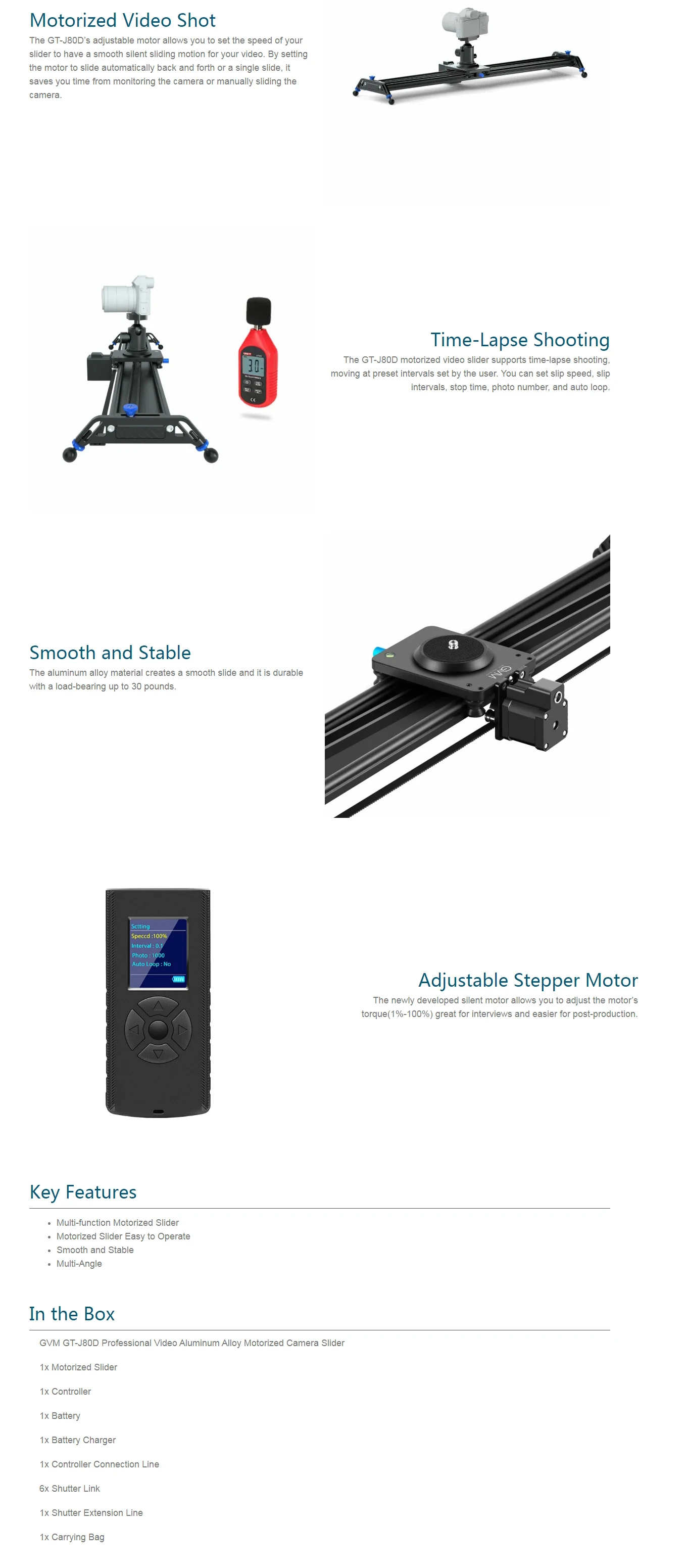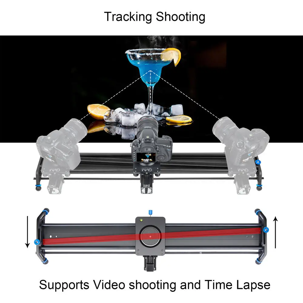 Регулируемый двигатель GT-J120D позволяет установить скорость слайдера для плавного и бесшумного скольжения видео. Установив двигатель, чтобы автоматически или один раз сползать назад и вперед, вы можете сэкономить время с помощью камеры наблюдения или вручную сдвинуть камеру.