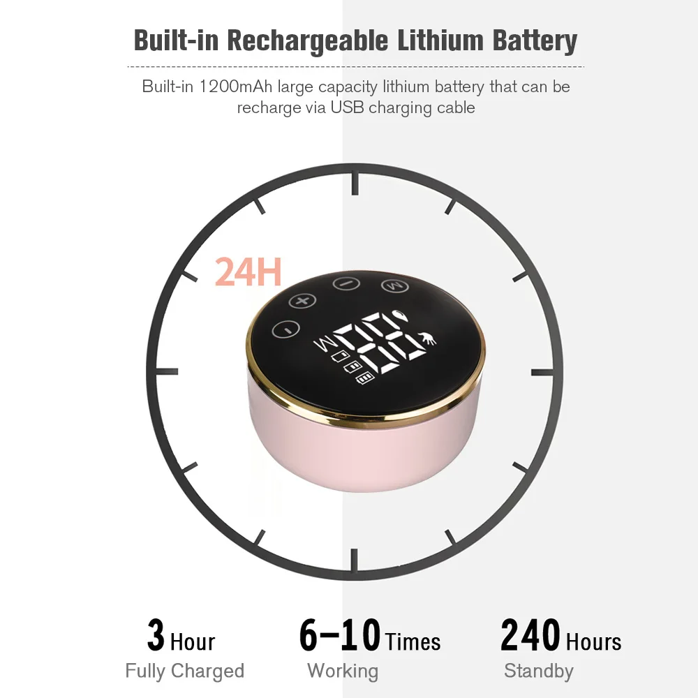 Переносной Электрический молокоотсос:Встроенный перезаряжаемый литиевый аккумулятор емкостью 1200 мАч, выдерживающий до 180 мл/6 унций молока, Электрический молокоотсос можно носить удобно и использовать в любое время в любом месте. Мамы могут даже накачать молоко во время работы по дому или игр с детьми.
