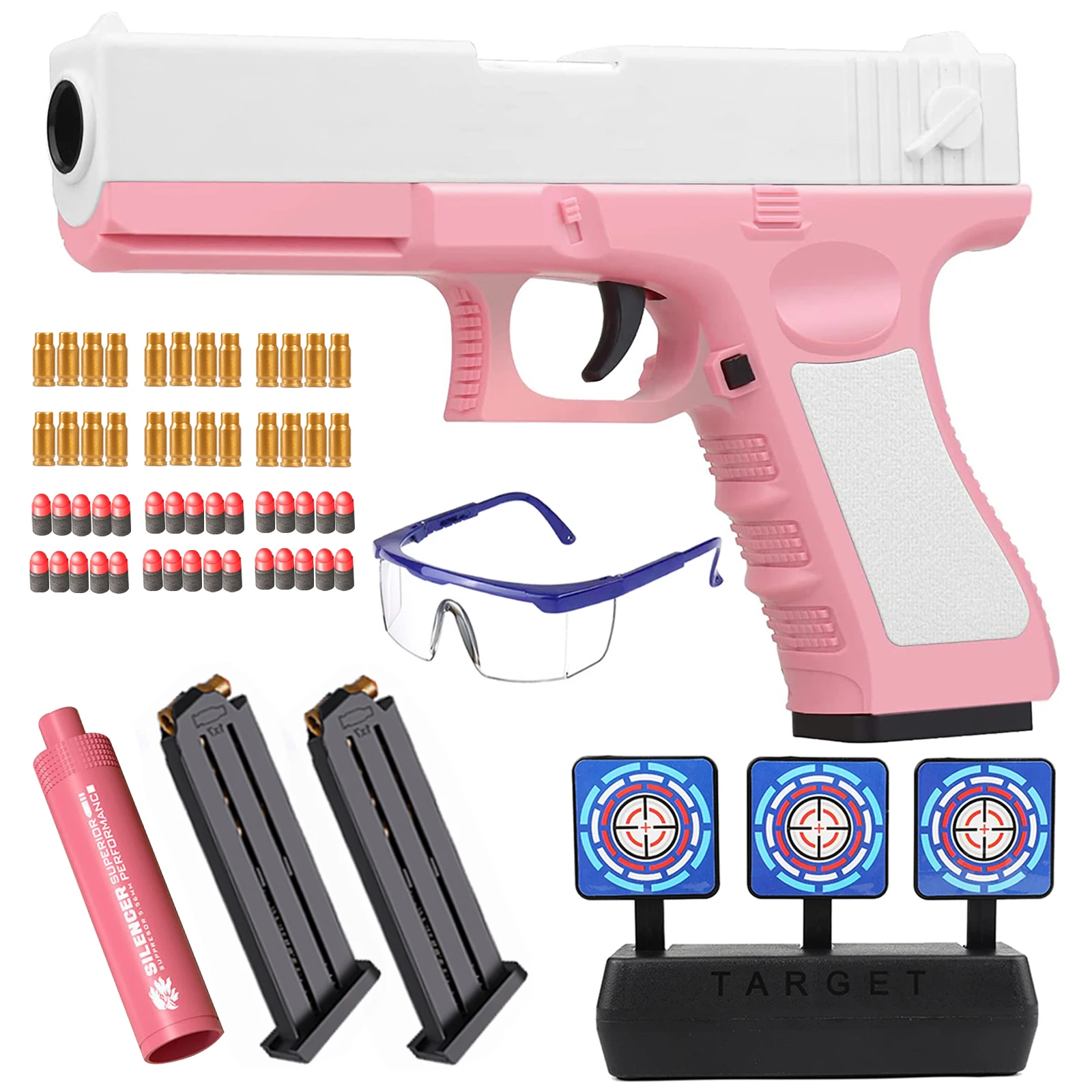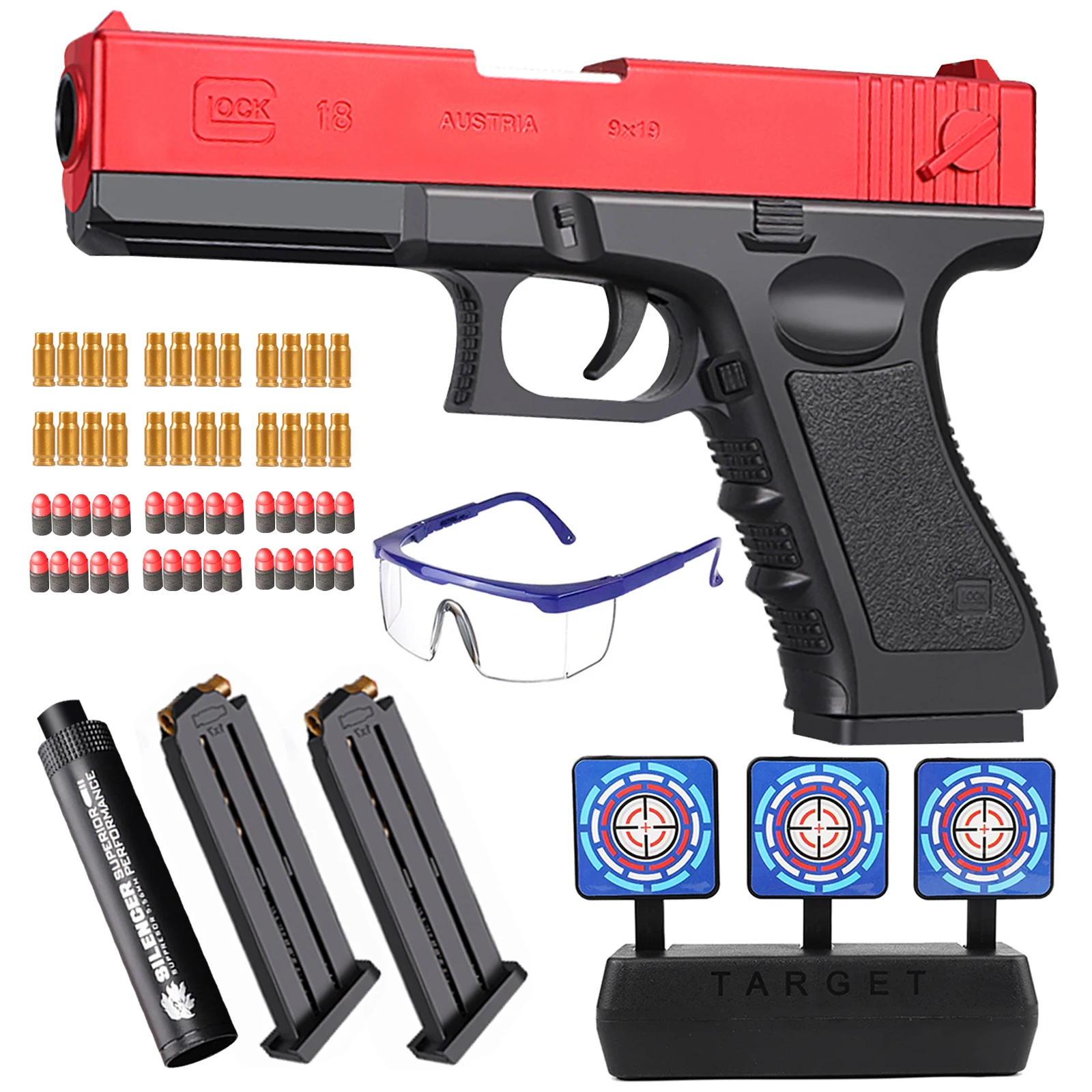 ★Упаковка включает в себя★: 1 игрушечный пистолет + 2 игрушечных журнала + 24 пустых игрушечных снаряда + 30 игрушечных мягких бомб + 1 глушитель + 1 очки + 1 мишень.
