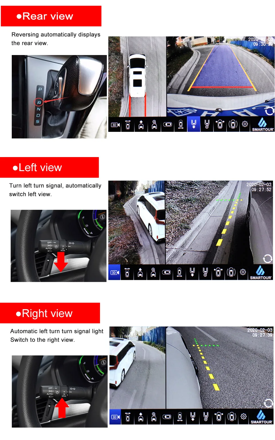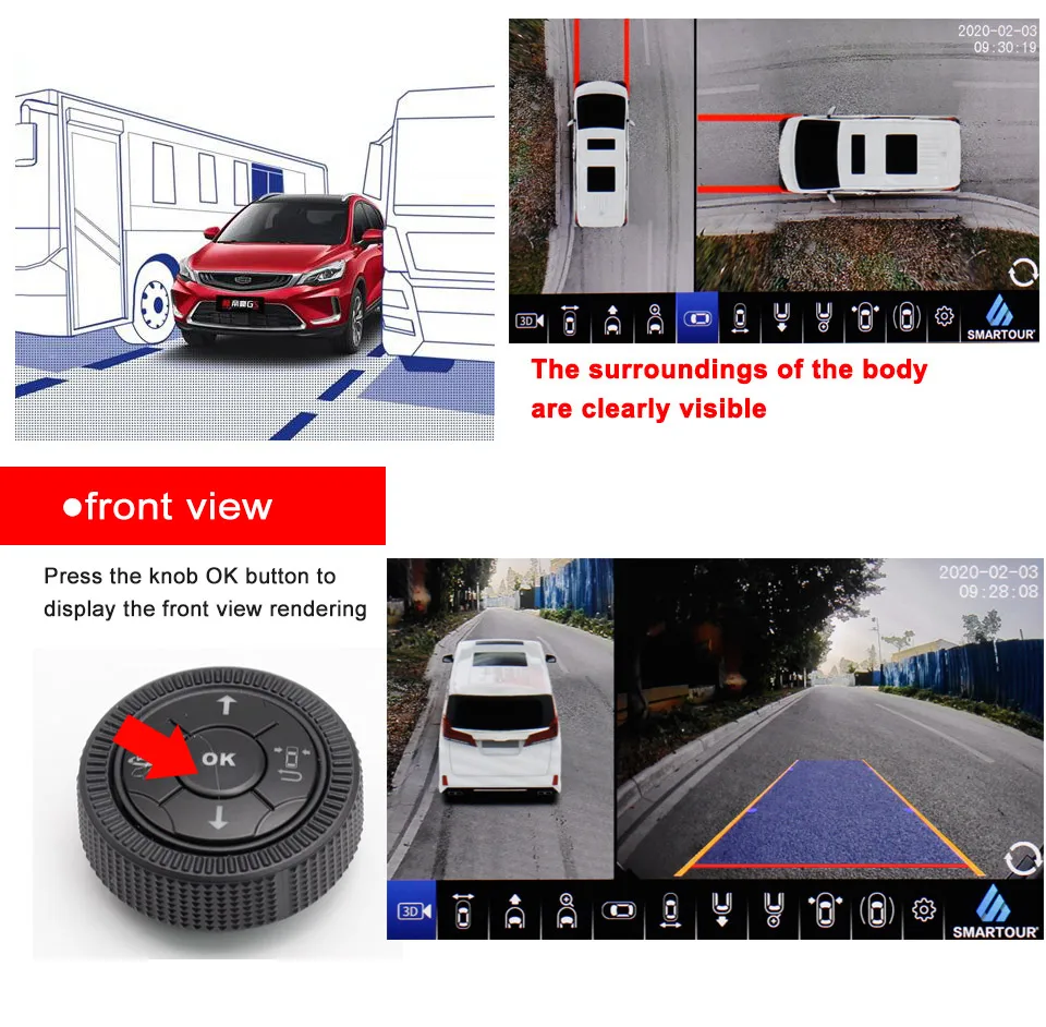 12. Язык OSD: Английский Основная функция: когда автомобиль задним ходом, поворот влево или вправо, 360 система триггера сигналом лампы, экран автомобиля автоматически переключается на задний, левый, правый вид, затем показать вид спереди после запуска. С функцией мониторинга парковки и видеорегистратором