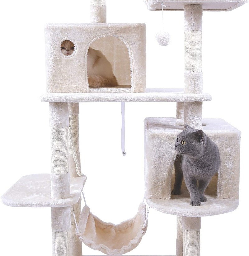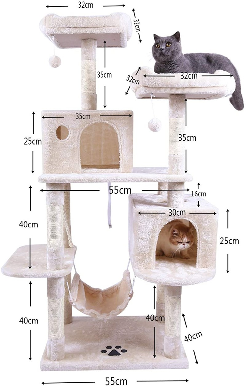 【Многофункциональный специальный дизайн 】Многоуровневая конструкция башни кошки, удобная для когтеточки, скалолазания, сна и занятий спортом; 2 вместительных жилета и 1 крепкий гамак предлагают Роскошный Опыт сна для большего количества кошек; Интерактивные ягодицы и шпагат Сизаля для игры.