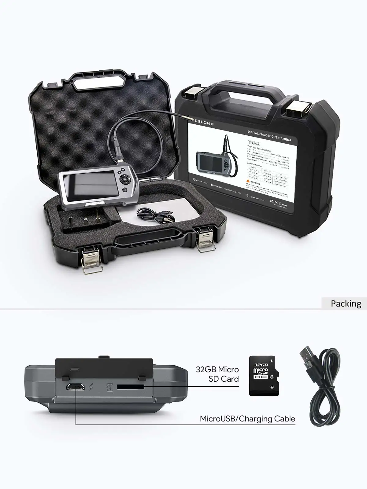 Что в коробке-эндоскоп монитор, зонд камеры, зарядный кабель, карта microSD 32G, аксессуары (зеркало с боковым видом, крюк, магнит), жесткий пластиковый ящик для инструментов, руководство пользователя, У нас, а также беззаботное её в течение 18 месяцев гарантии и вежливое обслуживание клиентов.