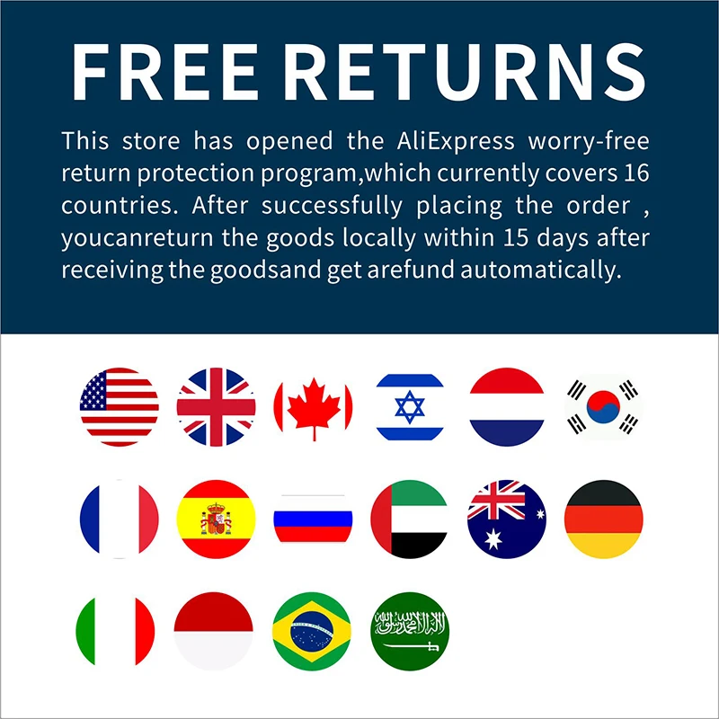 Выберите AliExpress стандартную доставку, вы можете воспользоваться преимуществами: только наши продукты имеют бесплатный логотип возврата, и следующие 24 страны могут бесплатно возвратить деньги без причины.