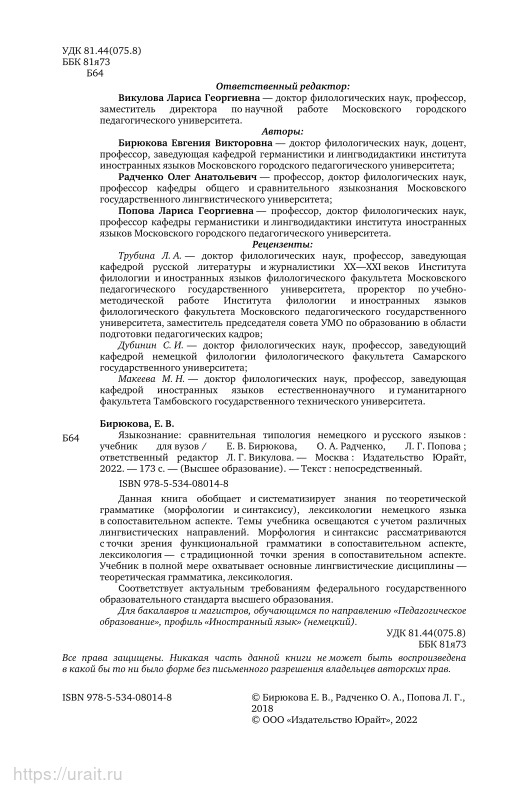 Данная книга обобщает и систематизирует знания по теоретической грамматике (морфологии и синтаксису), лексикологии немецкого языка в сопоставительном аспекте. Темы учебника освещаются с учетом различных лингвистических направлений. Морфология и синтаксис рассматриваются с точки зрения функциональной грамматики в сопоставительном аспекте, лексикология - с традиционной точки зрения в сопоставительном аспекте. Учебник в полной мере охватывает основные лингвистические дисциплины - теоретическая грамматика, лексикология. Соответствует актуальным требованиям Федерального государственного образовательного стандарта высшего образования. Для бакалавров и магистров, обучающимся по направлению "Педагогическое образование", профиль "Иностранный язык" (немецкий).