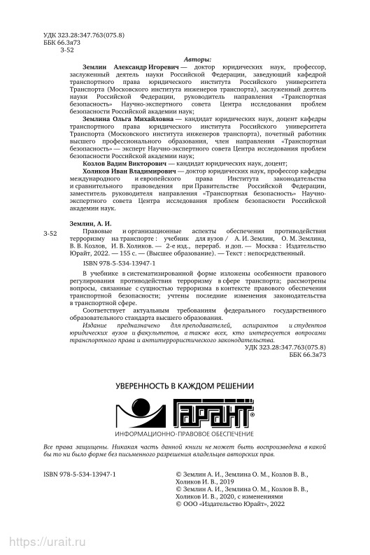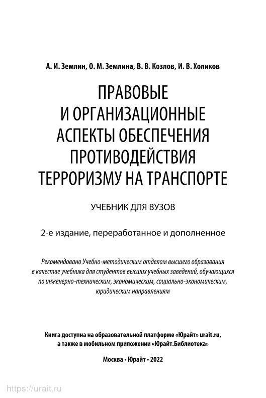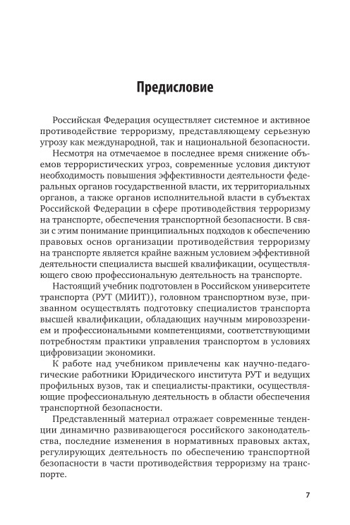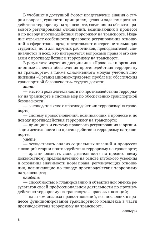В учебнике в систематизированной форме изложены особенности правового регулирования противодействия терроризму в сфере транспорта; рассмотрены вопросы, связанные с сущностью терроризма в контексте правового обеспечения транспортной безопасности; учтены последние изменения законодательства в транспортной сфере. Соответствует актуальным требованиям Федерального государственного образовательного стандарта высшего образования. Издание предназначено для преподавателей, аспирантов и студентов юридических вузов и факультетов, а также всех, кто интересуется вопросами транспортного права и антитеррористического законодательства.