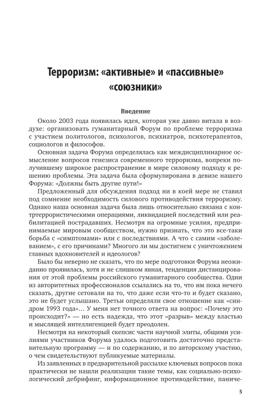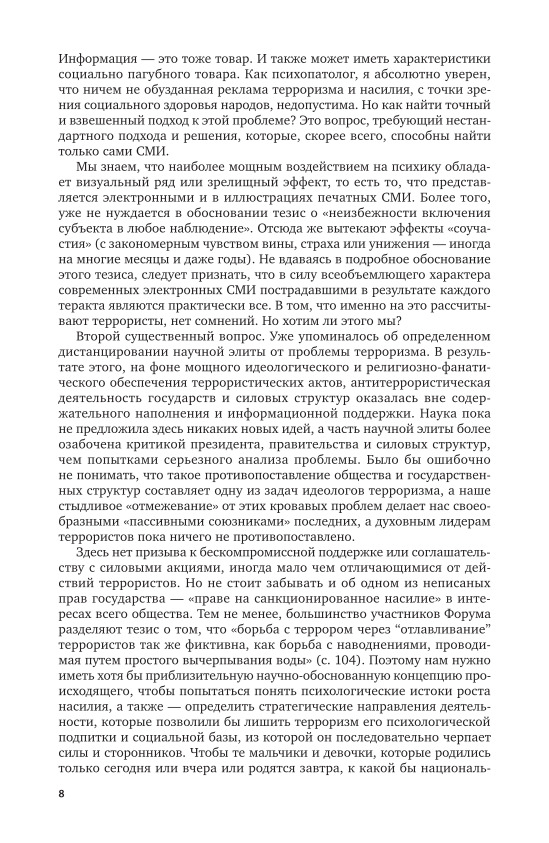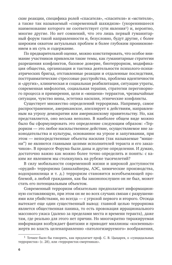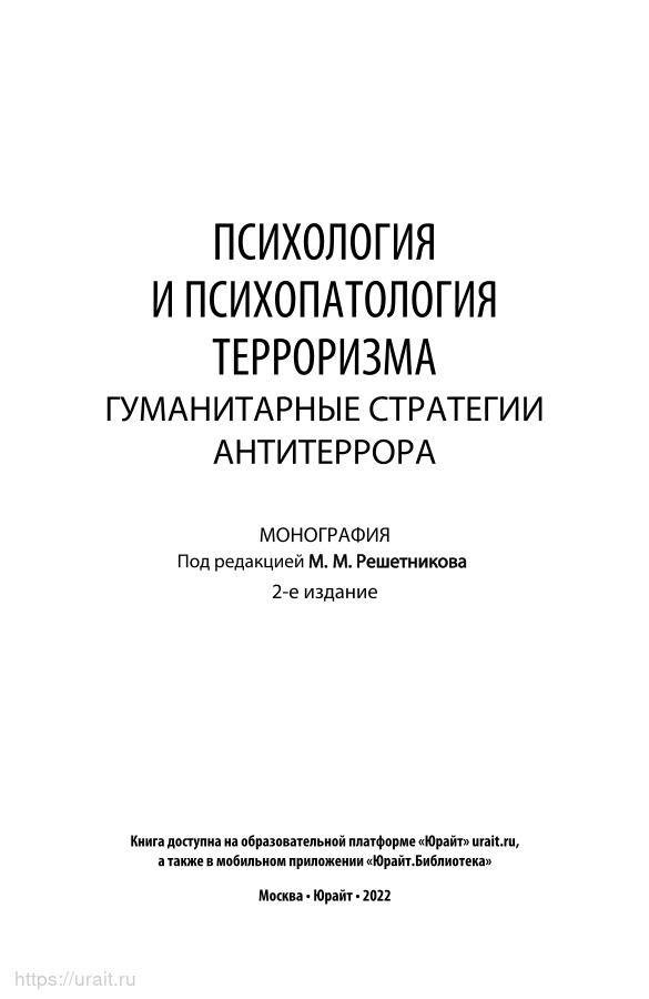 Издание представляет собой сборник статей, посвященных одной из актуальных тем современности - психологии терроризма. Авторы касаются таких аспектов проблемы, как психопатология и политическая психология терроризма, его социально-культурные предпоссылки, биотерроризм, агрессивное поведение и др. Рассматривается роль СМИ в террористических актах, описаны особенности помощи пострадавшим в чрезвычайной ситуации. Также задеты вопросы социальной идентичности, национального самоопределения и этнических конфликтов.