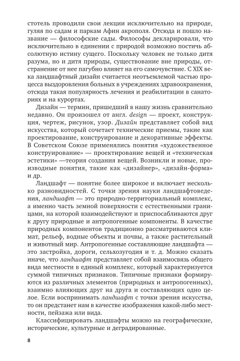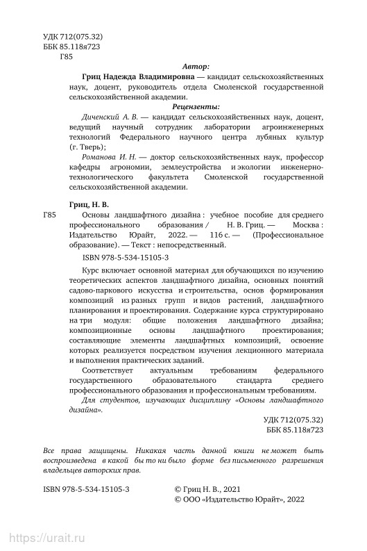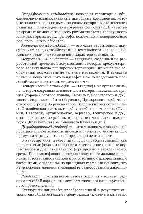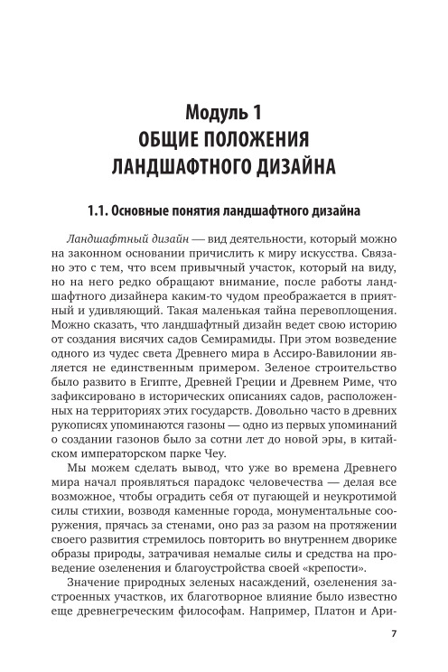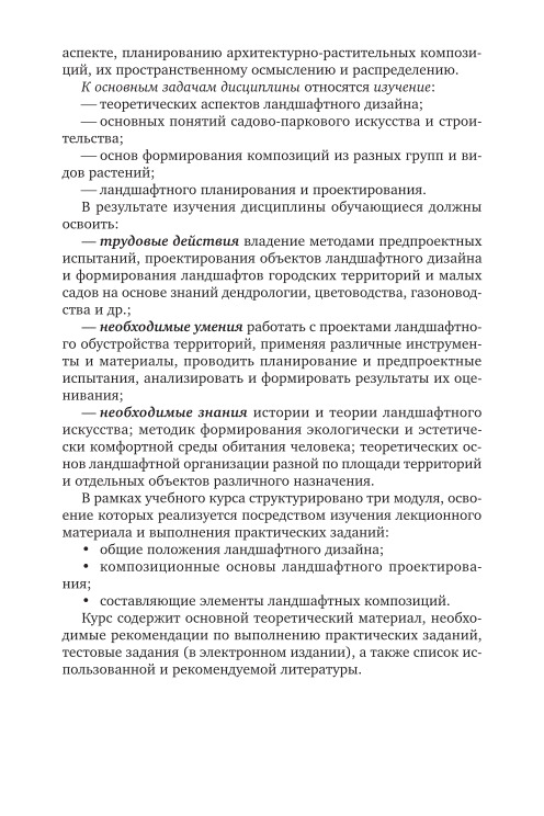 Курс включает основной материал для обучающихся по изучению теоретических аспектов ландшафтного дизайна, основных понятий садово-паркового искусства и строительства, основ формирования композиций из разных групп и видов растений, ландшафтного планирования и проектирования. Содержание курса структурировано на три модуля: общие положения ландшафтного дизайна; композиционные основы ландшафтного проектирования; составляющие элементы ландшафтных композиций, освоение которых реализуется посредством изучения лекционного материала и выполнения практических заданий. Соответствует актуальным требованиям федерального государственного образовательного стандарта среднего профессионального образования и профессиональным требованиям. Для студентов, изучающих дисциплину "Основы ландшафтного дизайна".