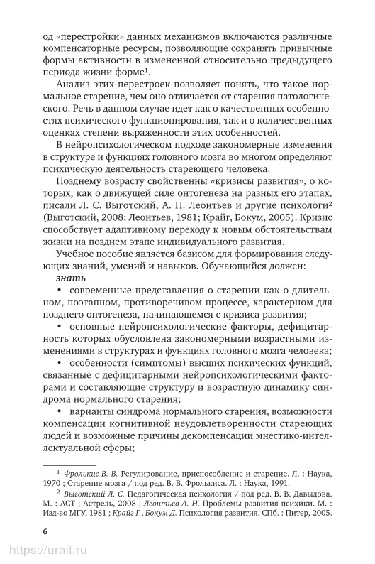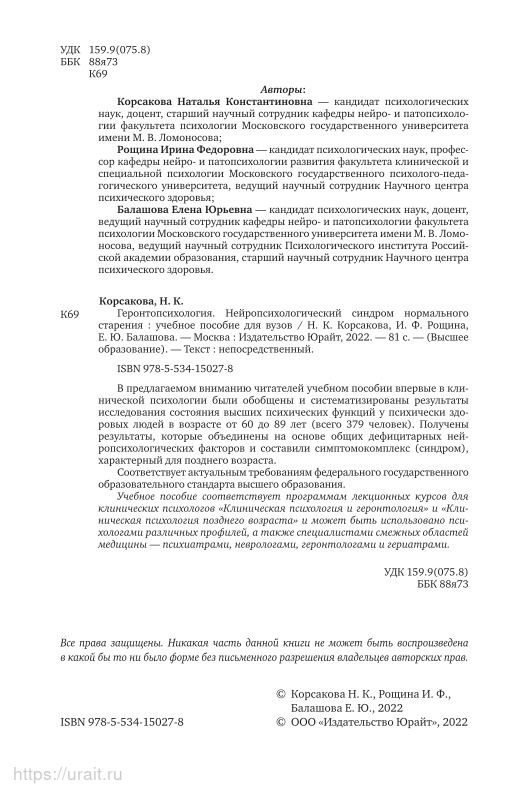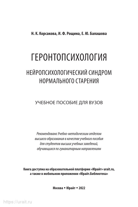 В предлагаемом вниманию читателей учебном пособии впервые в клинической психологии были обобщены и систематизированы результаты исследования состояния высших психических функций у психически здоровых людей в возрасте от 60 до 89 лет (всего 379 человек). Получены результаты, которые объединены на основе общих дефицитарных нейропсихологических факторов и составили симптомокомплекс (синдром), характерный для позднего возраста. Соответствует актуальным требованиям федерального государственного образовательного стандарта высшего образования. Учебное пособие соответствует программам лекционных курсов для клинических психологов "Клиническая психология и геронтология" и "Клиническая психология позднего возраста" и может быть использовано психологами различных профилей, а также специалистами смежных областей медицины - психиатрами, неврологами, геронтологами и гериатрами.