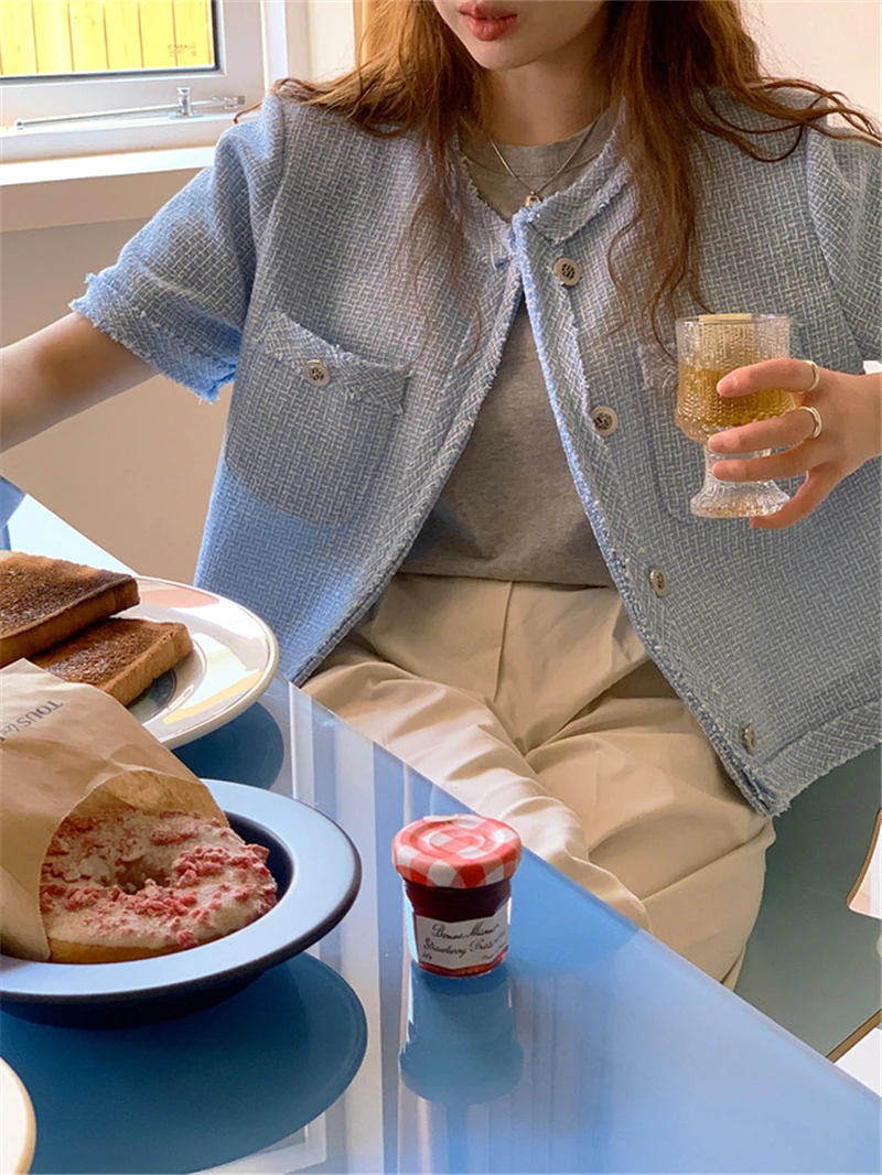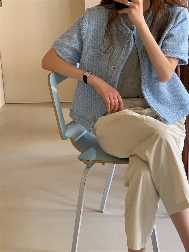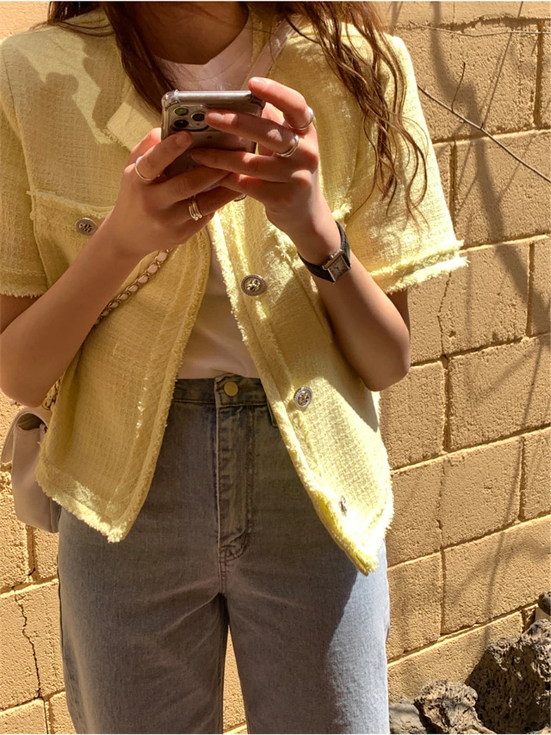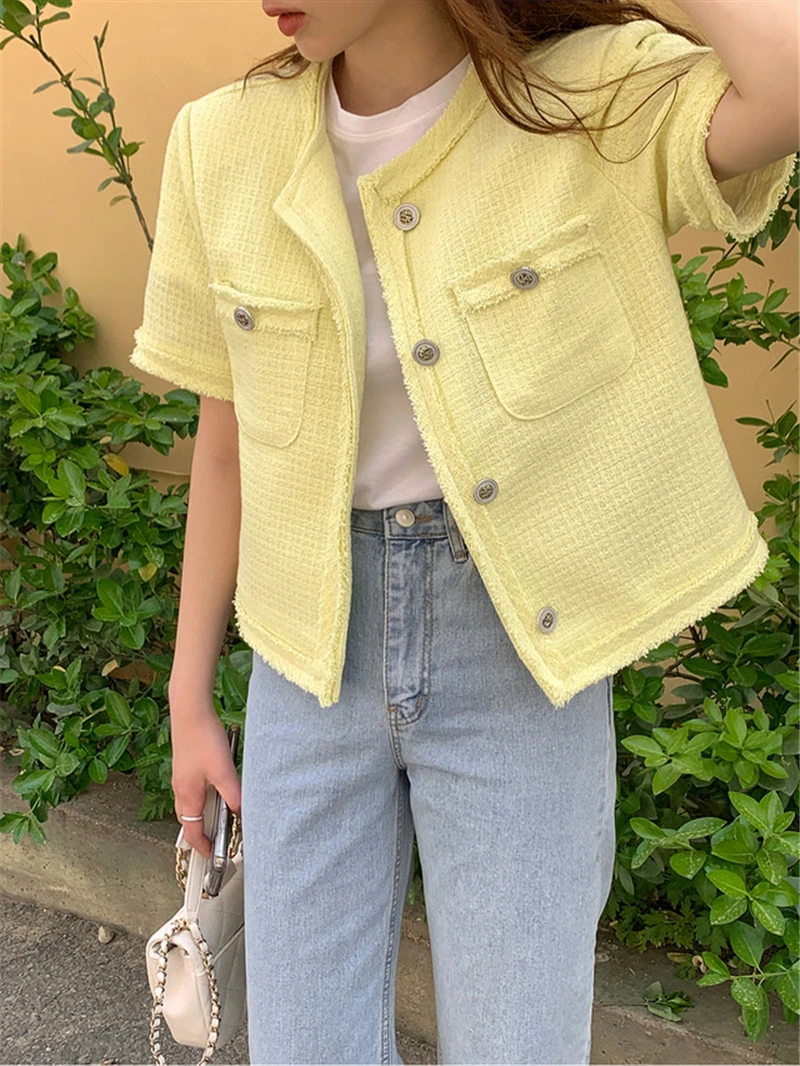 Шерстяные твидовые куртки, винтажные шикарные кардиганы с коротким рукавом, Женские однотонные пуговицы, Свободное пальто с круглым вырезом, корейские темпераментные Топы N381