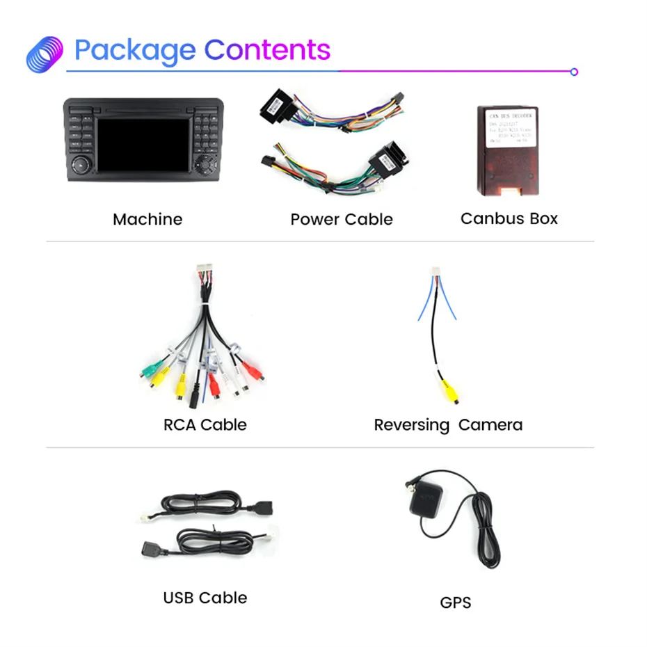 frames+one navigation machine+power cables+one reversing camera video input cable with WiFi and Bluetooth signal cables+two USB cables+one GPS antenna cable+one RCA cable with external microphone input+one external microphone gift