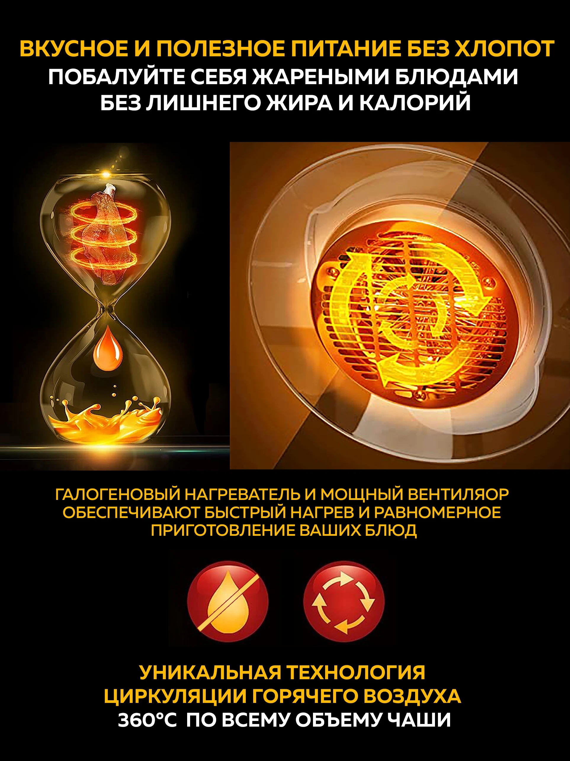 - Галогенный нагревательный элемент и мощный вентилятор обеспечивают циркуляцию воздуха по всему объему чаши