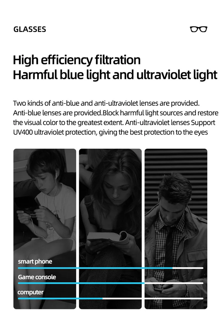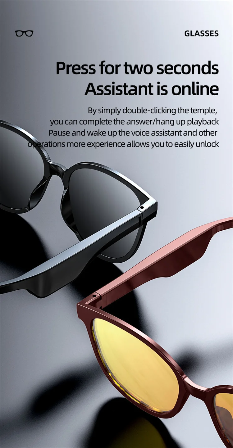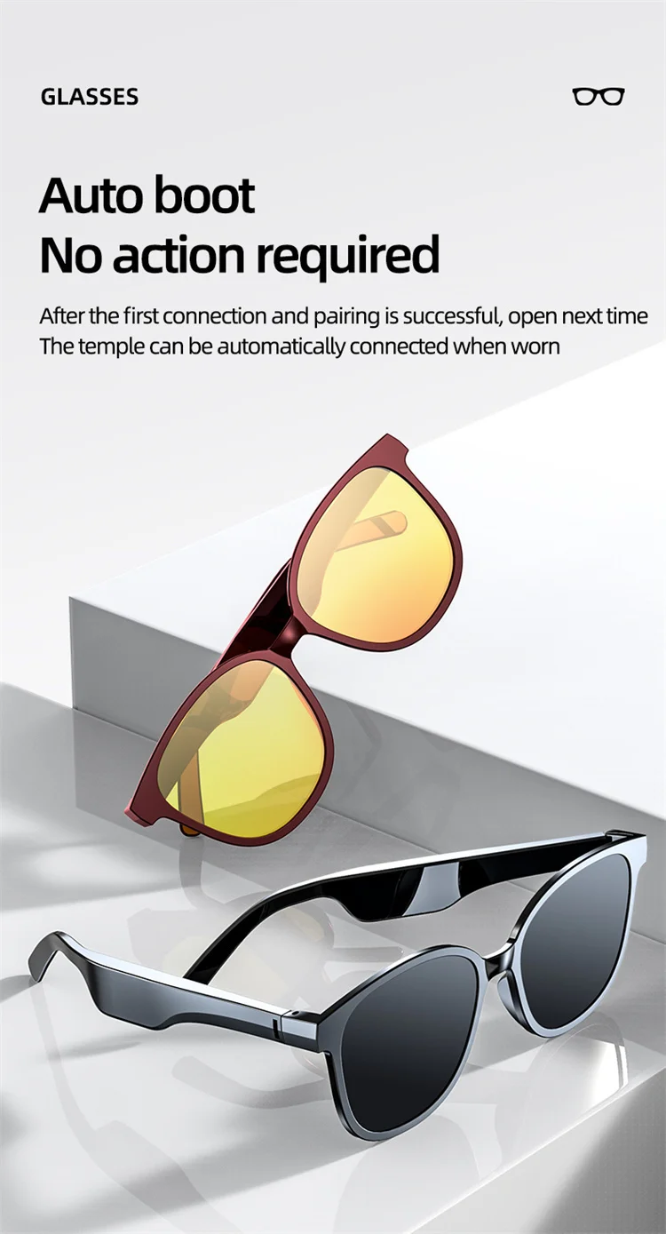 1. Bluetooth-динамик для очков: Динамический привод, уникальный дизайн звуковой полости, чтобы избежать нарушения слуха. Дизайн с открытыми ушами помогает вам оставаться в курсе вашего окружения, избегать опасностей и наслаждаться музыкой.