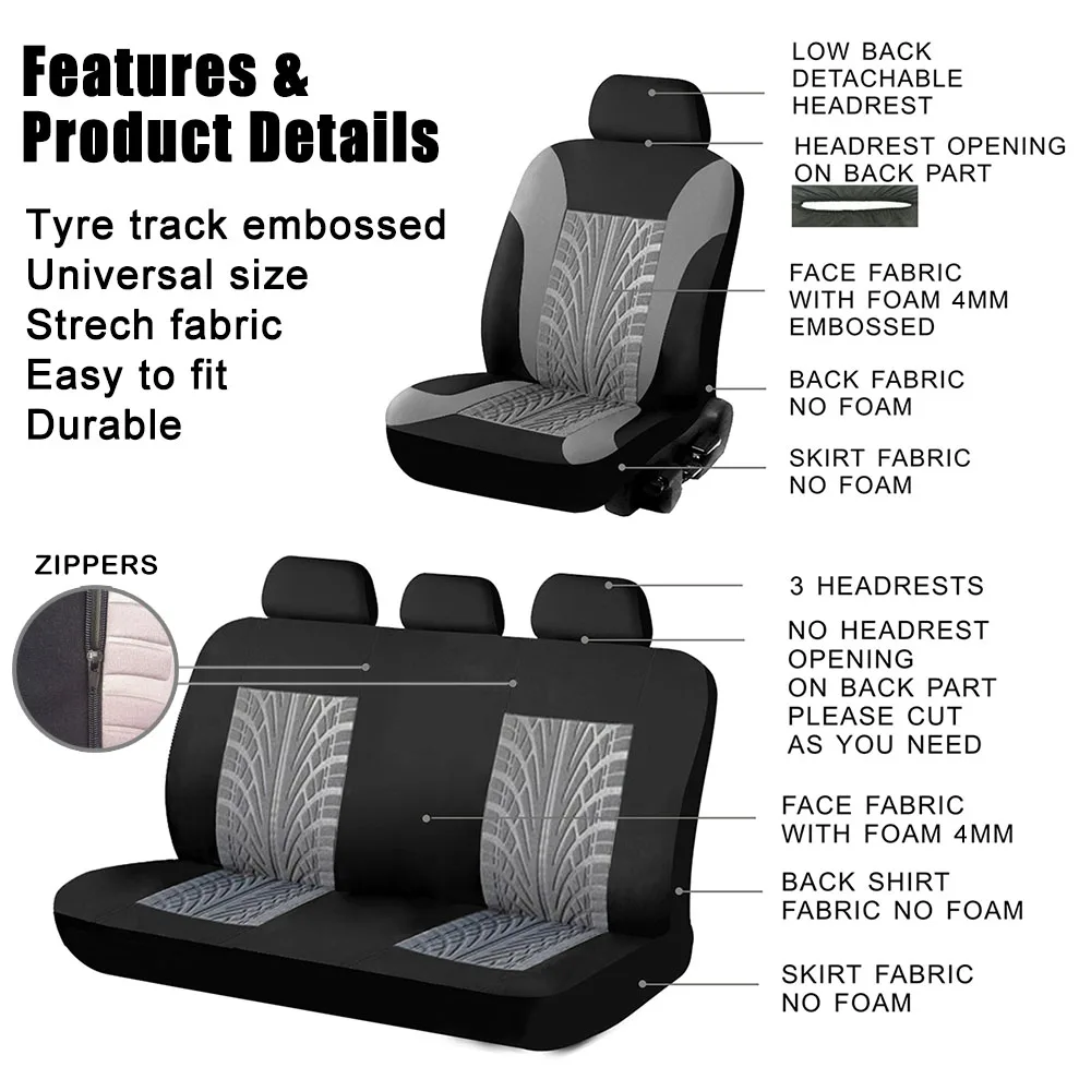 Особенности: ● 100% новый, высокое качество ● Широкий фарбик и универсальный размер подходит для большинства автомобилей, седанов и кроссоверов ● 3D рельефный дизайн шин посередине, модный и крутой ● Технология шитья с 5 нитями обеспечивает гораздо лучшую прочность ● Защитите сиденья, держите их чистыми и новыми ● Легко устанавливается и стирается Материалы: ● Лицевая ткань: высокоэластичная 100% полиэфирная ткань с отчетом о тестировании AZO free ● Под пеной: Высококачественная пена высокой плотности 4 мм, 100% толще, чем 2 мм пенопласт ● Эластичная петля: изготовлена из высококачественной эластичной ленты со 100% содержанием Tensil Цвет: Серый, синий, красный, розовый У нас есть 2 варианта для вас: полный комплект и 2 передних сиденья Полный комплект ● Полный комплект включает: 2 передних сиденья + 1 заднюю часть + 1 заднее сиденье + 5 подголовников ● Полный набор Цена: USD 39,98 ●Full комплект Вес: 0,75 кг ● Полная посылка Размеры: 40*27*8 см/13,5*10,7 * 3.2in 2 передних сиденья ● 2 передних сиденья включают: 2 передних сиденья + 2 подголовника ● 2 передних сиденья Цена: 24,98 долларов США ● 2 передних сидений Вес: 0,4 кг ● 2 передних сидений посылка размеры: 27*20*8 см/10,7*7,8 * 3.2in