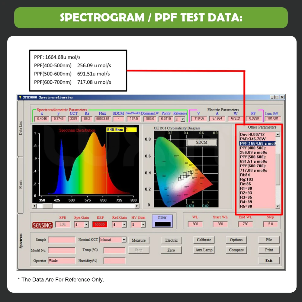 Фотосинтетический Фотон эффективность (PPE) (µmol/J) : 2,7-2,9 μmol/J