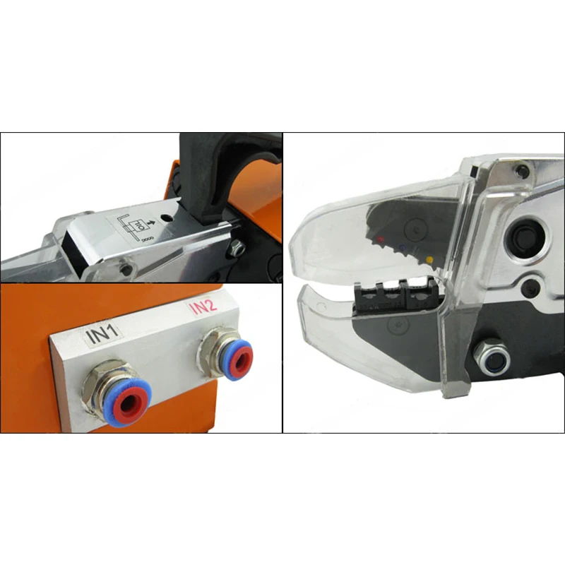 1. Диапазон: неизолированные терминалы ≤ 10 мм2, Предварительно изолированные терминалы ≤ 6 мм2, Проволочные наконечники ≤ 25 мм2 2. Выходная сила: 13,5кн 3. Применимые давление воздуха: 0,4-1Mpa Примечание: 1 Набор пневматических обжимных инструментов содержит 1 набор штампов: A03C A03C: Для 0,5-6mm2 предварительно изолированных клемм