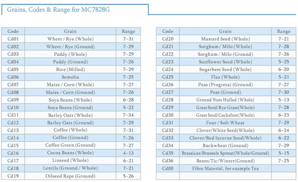 Зерна, коды и диапазон для MC-7828G