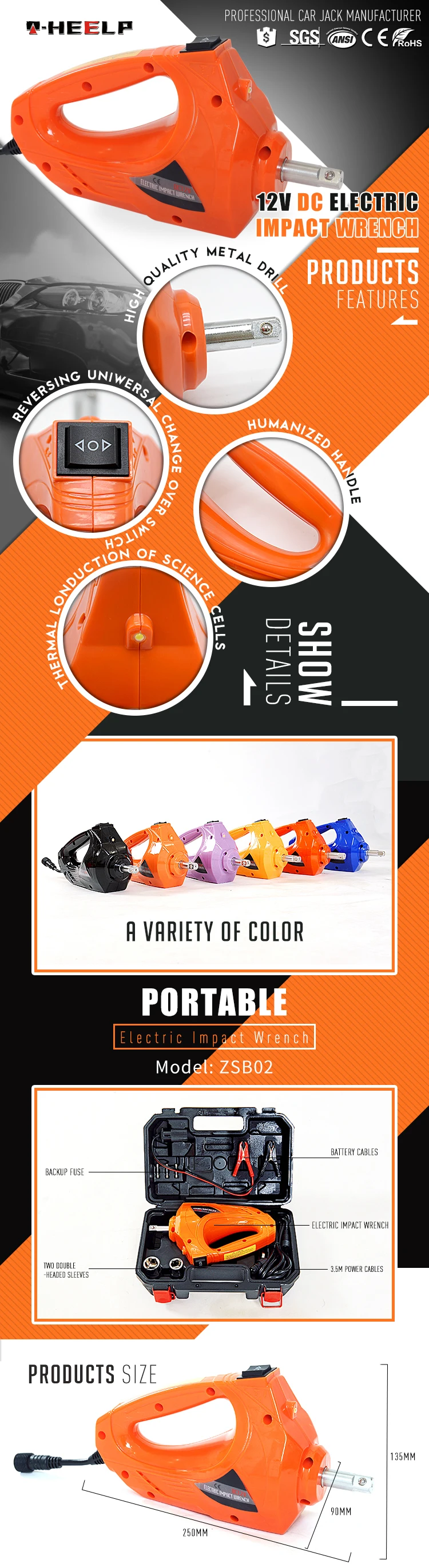 Place of Origin: Zhejiang, China (Mainland) Brand Name: ZSModel Number: ZSB02 Power Source: Electricity Type: Impact Wrench Rated Voltage: DC 12V Rated Input Power: 100W Max. Torque: 350N.M No-Load Speed: 0-2200/min Frequency: 0-3200/min Dimensions: 25x9x13.5CM Weight: 2.85 / 3.1KGS Product name: Super cheap 12v impact battery powered lug wrench Rated power: 100W Operating Voltage: DC12V Max.current: 13A Max.Torque: 480N.M Socket size: 17.19/21.23MM Power Cable: 3.5m