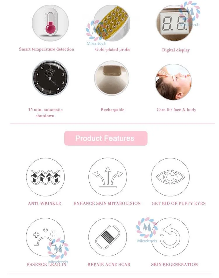 1. Интеллектуальный контроль температуры, датчик температуры beauty head проводит контроль температуры в реальном времени и отображает проверенную температуру светодиодный. Выходная RF энергия будет автоматически регулироваться чипом.