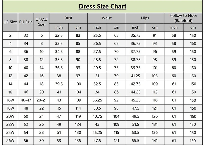 Таблица стандартных размеров ниже приведена для справки