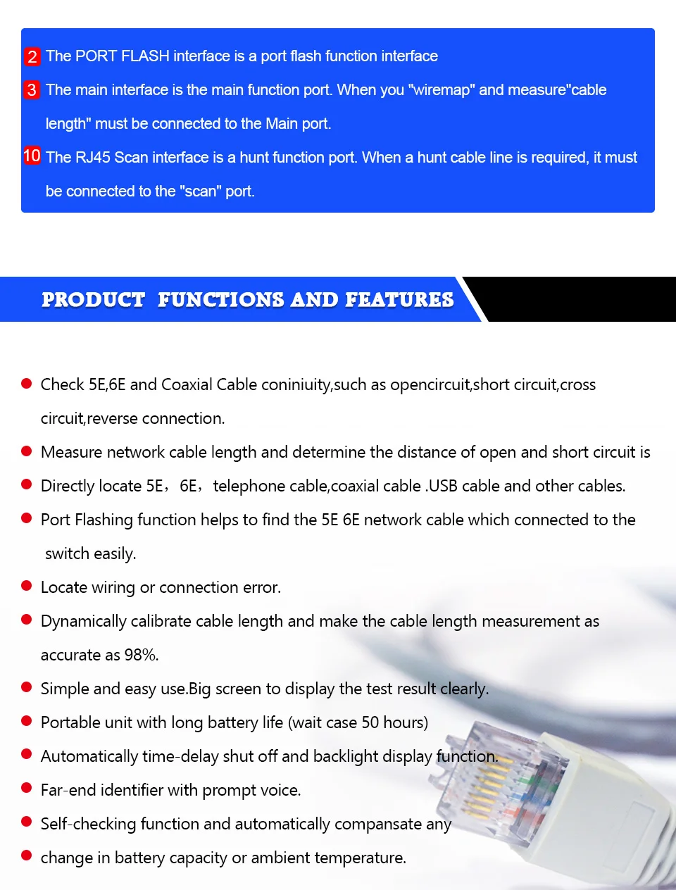 Измерьте длину кабеля | RJ45 | RJ45 | RJ45 | RJ45 + BNC | RJ45 + RJ11 | RJ45 + BNC |