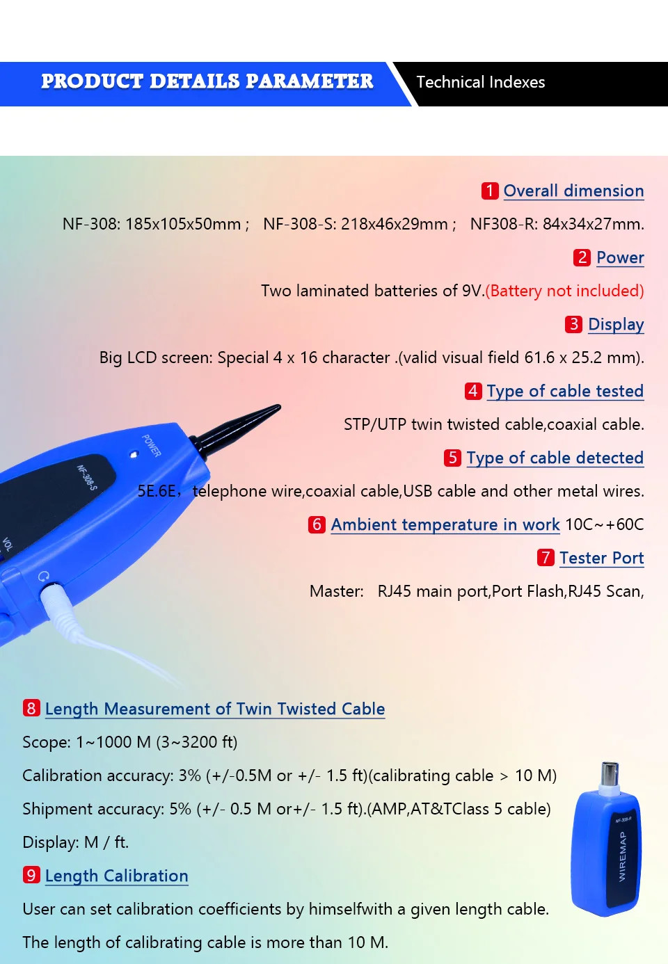 NF-308Многоцелевой сетевой кабель тест Охота провода Сортировка длина кабеля тест 5E 6E коаксиальный кабель RJ45 синий цвет