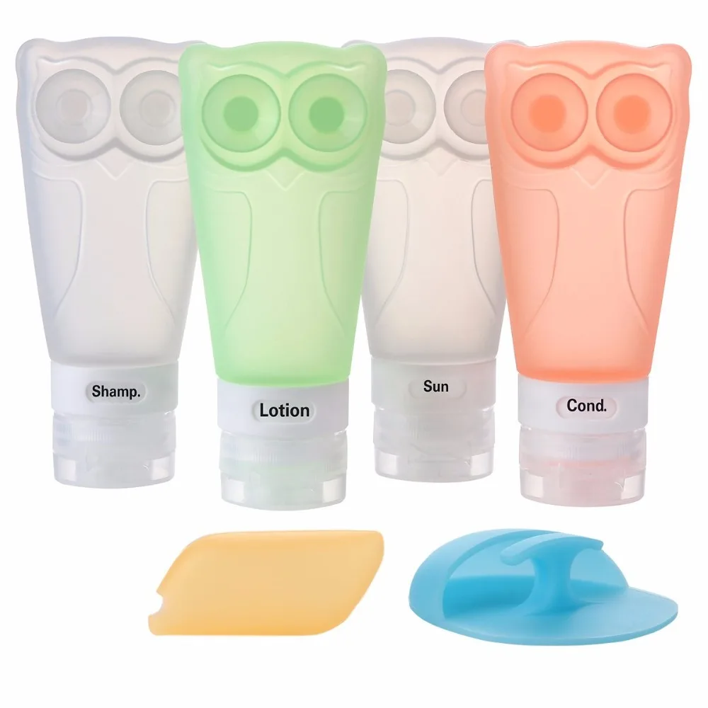 ❤Посылка в комплекте-4 шт. 2,8 oz Сова путешествия размер бутылки (1 шт.), Мягкая силиконовая щетка для ухода за лицом; 1 для зубной щетки. Все они упакованы в прозрачный пластиковый чехол для переноски, одобренный TSA и безопасный для переноски/путешествий через самолет.