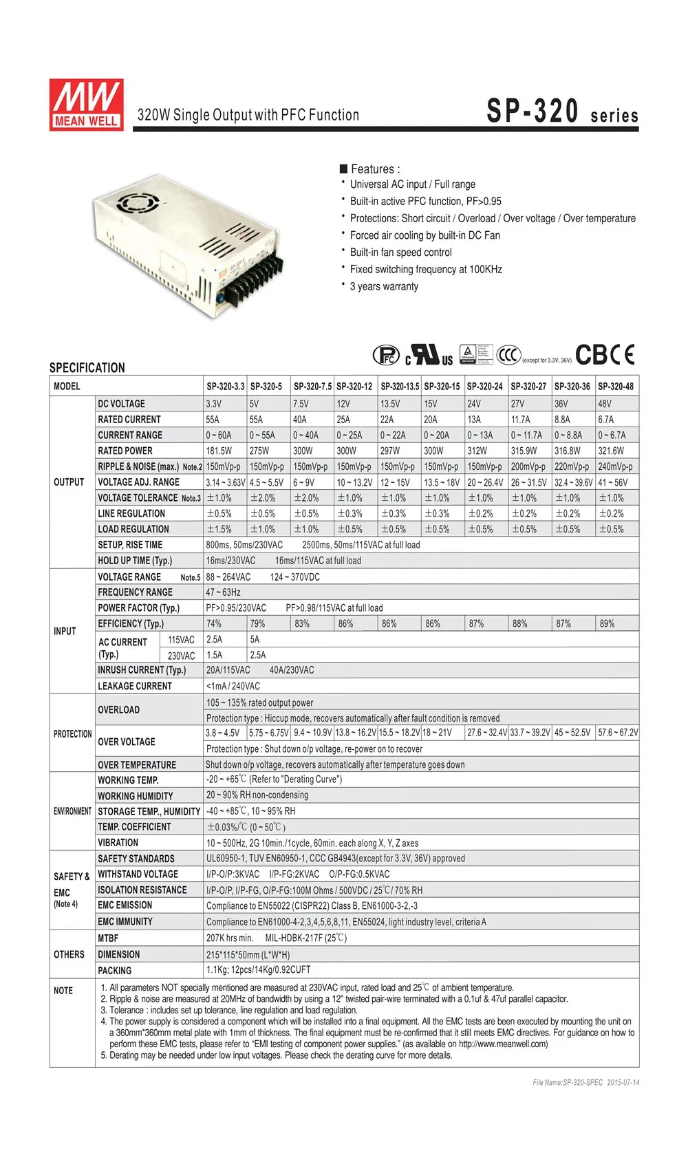312W 13A 24V Питание Meanwell SP-320-24 с функцией PFC UL TUV CB EMC CE