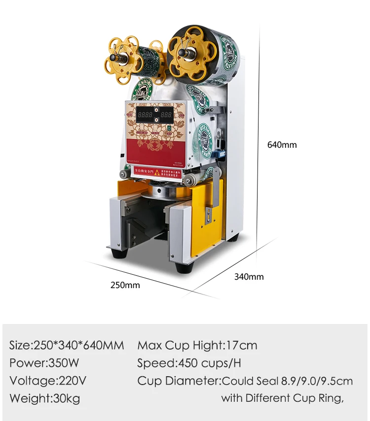 Размер: 250*340*640 мм Мощность: 350 Вт Напряжение: 220 В Вес: 30 кг Максимальная высота чашки: 17 см Скорость: 450 чашек/ч Чашка Диаметр: не могли бы уплотнение 8,9/9,0/9,5 см с различными кольцо чашки,