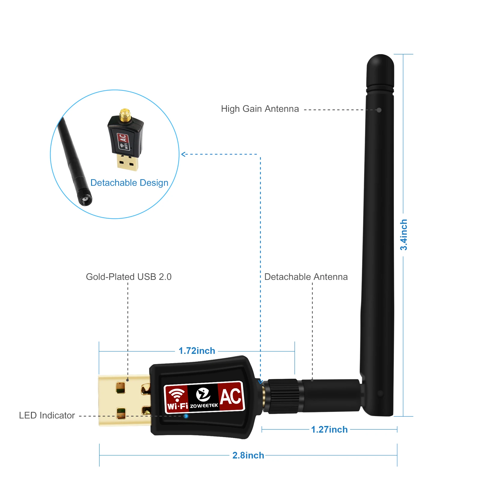 Мини-адаптер Wi-Fi Zoweetek, 2 д600 Мбит/с, 802.11ac, 2,4G/5G