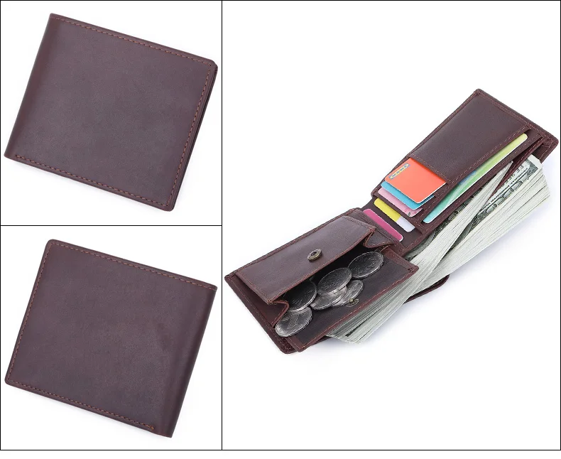 Функция: Этот мужской кошелек изготовлен из кожи crazy horse. Это Европейский стиль, с карманом для монет. Он может держать 6 карт, некоторые монеты и бумажные деньги. Он прочный. Вы можете использовать его в течение многих лет.