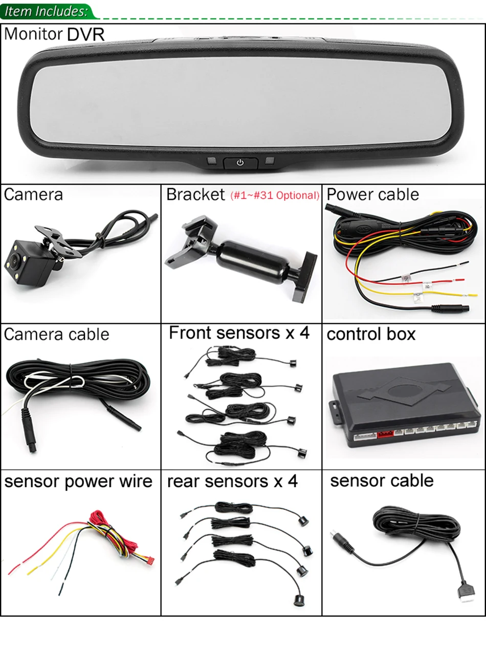 * HD 5 дюймов 854*480 IPS ЖК-экран. Яркость: 500 кд/м2 (макс.). * Специальный оригинальный металлический кронштейн, идеально подходит вашему автомобилю. * Чипсет Novatek 96658. 2 камеры видео рекордер черный ящик. * Автоматическое переключение на изображение заднего вида при переключении на обратную передачу. * Широкий угол 140 ° для задней камеры. * Видео датчик парковки с 4 датчиками. Дисплей на зеркальном мониторе. * 170 ° Широкий угол для фронтальной камеры, направление камеры можно регулировать. * Можно делать фотографии с этим продуктом (1200 Вт пикселей) * Когда вы Остановите автомобиль, он начнет запись, как только у него будет небольшая вибрация * Разрешение видео: 1080P (1920*1080) / 720P (1280*720) / VGA (720*480) • Камера с 6 слоя стеклянная линза для записи Full HD видео. * Поддержка g-датчика, обнаружения движения. * Поддержка циклической записи. * Диафрагма F2.0, хорошее зрение в ночное время. * Зеркало выглядит как нормальное зеркало, когда камеры не включены. * Интеллектуальная технология обработки изображений, обработанная WDR и HDR, чтобы убедиться, что изображение в любое время. * Стиль записи: фронтальная камера, камера заднего вида, фронтальная и задняя камера могут быть изменены одновременно. * Язык: английский, русский, испанский, немецкий, корейский, японский, французский, португальский, итальянский, упрощенный китайский, традиционный китайский, иврит