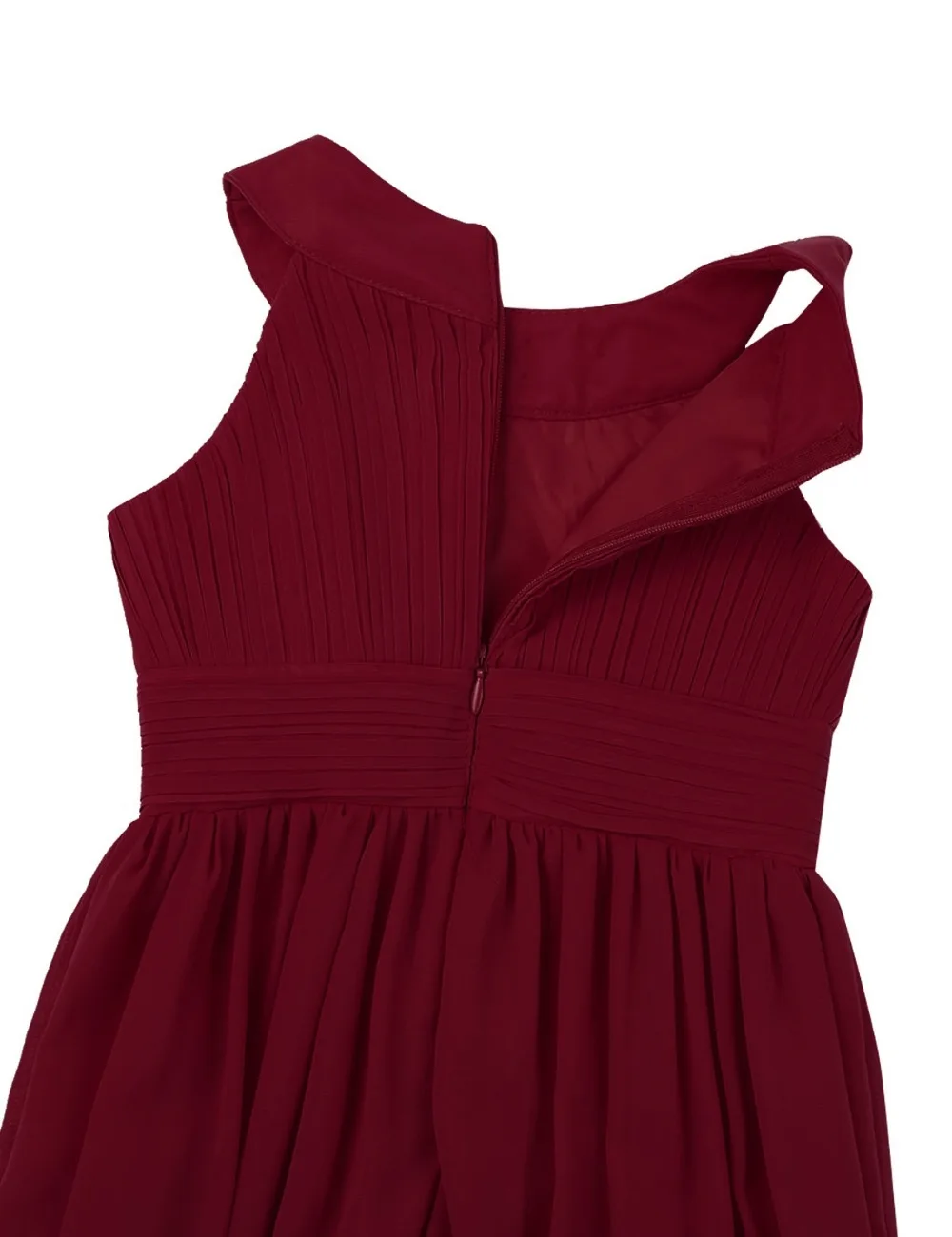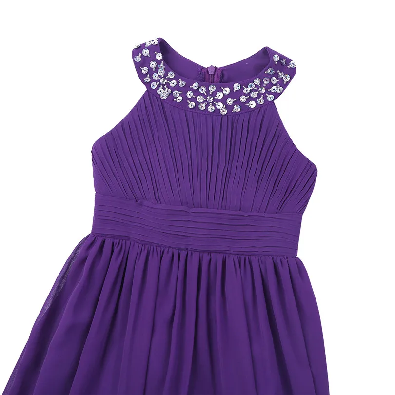 Вырез спереди украшен блестками и бусинами, лиф со складками. Плиссированный дизайн с высокой талией, скрытая молния сзади.